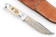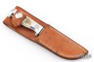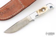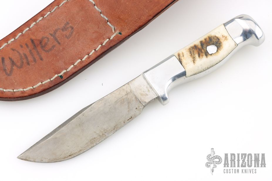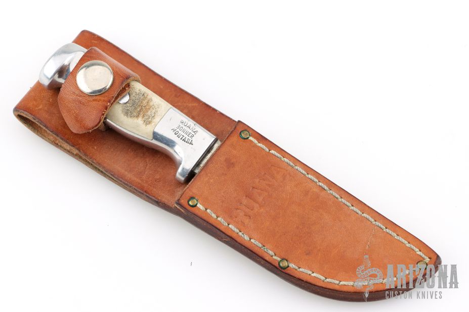 This skinner by Ruana Knives features a satin finished blade with a hidden tang construction.  .116" Blade Stock.  .935" Blade Depth.  The handle is cast aluminum with elk horn inlays. Comes with a brown Ruana sheath. Has scratches and patina, otherwise the knife is in good condition.