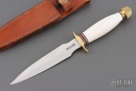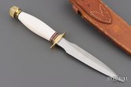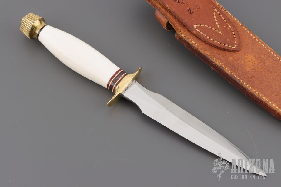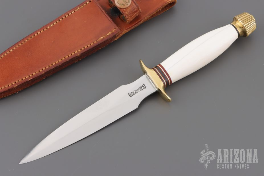 This Model 2-5 by Randall Made Knives features a satin finished double edged blade, .154" blade thickness and .927" blade depth, hidden tang construction. The Model 2 is a heavily made dagger or dirk. Brass guard and butt, red/white/blue spacers. Comes with a Heiser brown button brown leather sheath and a zippered case. The handle has a stabilized crack on the presentation side, has a few light scratches on the blade, otherwise excellent condition for its age. Made between 1960 and 1962