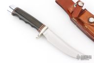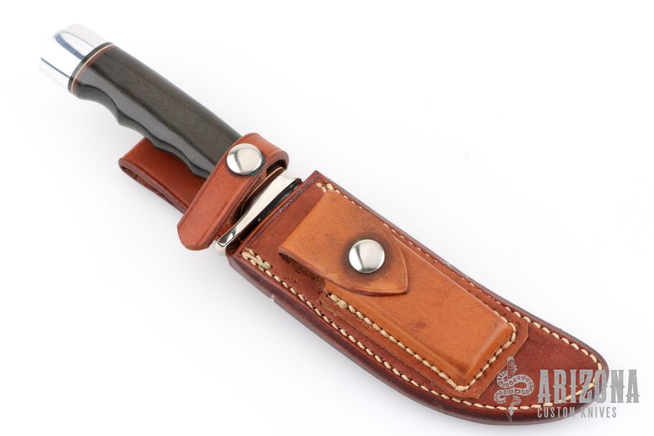 This Model 4-5 by Randall Made Knives features a satin finished blade with false top edge, .209" blade thickness and 1.034" blade depth, hidden tang construction. The handle has a nickel silver guard, black liner micarta finger groove grip with red/white/blue (7) spacers. Comes with a Johnson roughback brown leather sheath and a zippered case. Excellent condition. Made in the early 70s