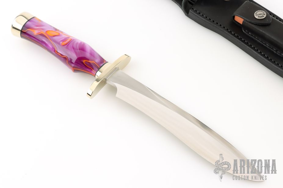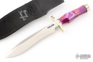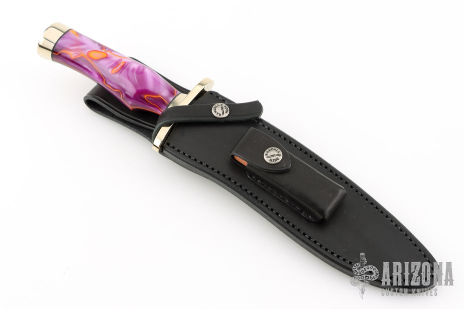 This knife is RARE. it is one of only 3 Sasquatch knives with kirinite handles. The consignor contacted the company in Chicago that produces the Kirinite material and they said they have not produced the Kirinite material with the vivid swirl design that this knife has in over 20 years. All Kirinite produced since then has had much less vivid swirling and colors.