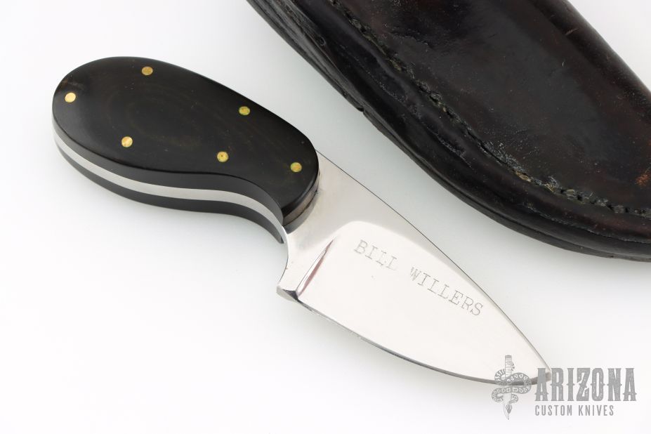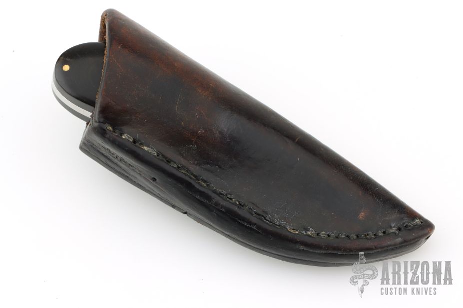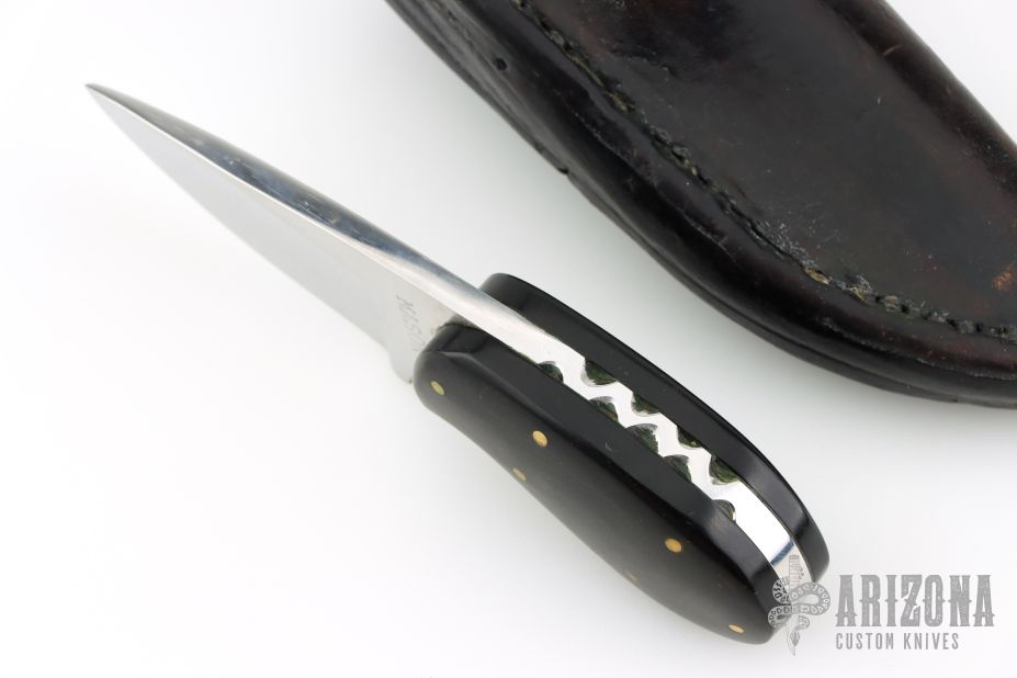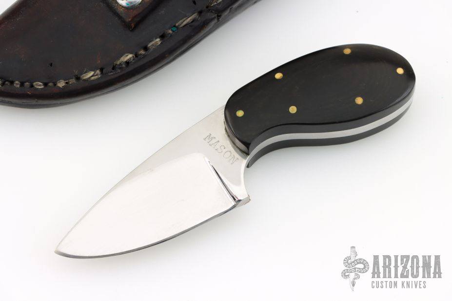 This knife by Mason features a polished drop point blade with .188" blade stock and 1.1" blade depth, full tang construction. The tang has been file-worked and there are pinned micarta covers on the handle. Comes in a laether belt sheath. Has scratches throughout. Good overall condition.