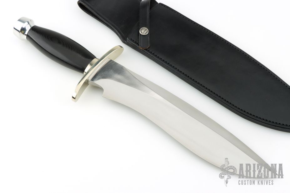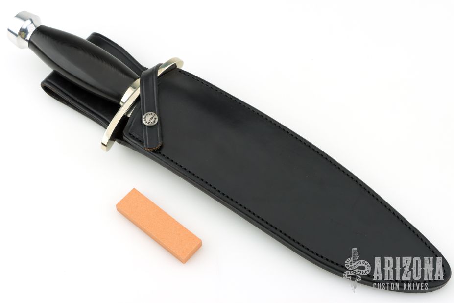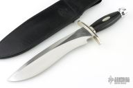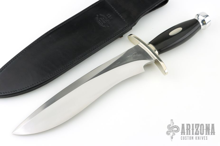 This Sasquatch by Randall Made Knives features a satin finished recurve blade with sharpened top edge, .340" blade stock and 2.212" blade depth, hidden tang construction. The handle has a forward curved nickel silver guard and a duralumin butt, black linen micarta grip with nickel silver escutcheon (name plate) black spacers. Comes with a black leather sheath and a zippered cae. #218on the blade. Excellent condition.