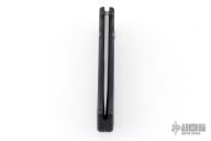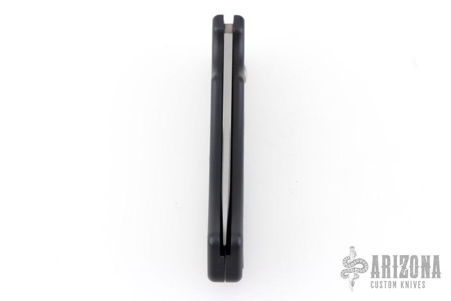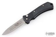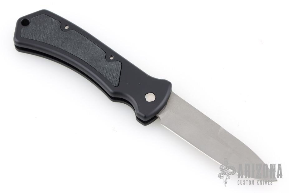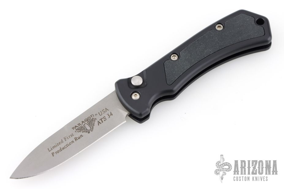 This Side-opening coil spring automatic by Paragon features a bead blast drop point blade. Black aluminum frame with rubber inlays. Has a small nylon belt sheath. Has some scuffs and scratches, good condition otherwise.