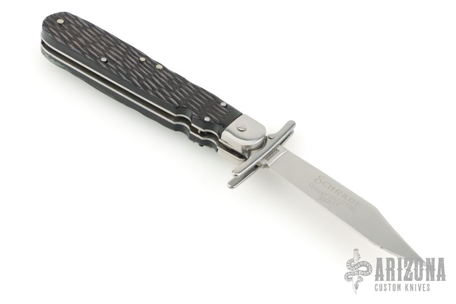 SCHRADE CUT CO SCC2010 Collector Society Giveaway Hunter's Pride copy knife NIB. This is a manual folding copy of the Schrade Cut Co Hunter's Pride knife that was made in 2010 as a Welcome Gift when you joined the Schrade Collector's Society. This knife is New in the original box and measures 4 7/8" closed and 8 5/8" open and it has steel liners, bolsters, guards & button. The clip blade is full and engraved EVERLASTINGLY SHARP on the face and the tang is stamped SCHRADE CUT CO. The back of the blade is engraved SCHRADE CUTLERY COLLECTORS SOCIETY and the back tang is stamped SCCS2010. You have to press the button to release the blade to be opened manually and also press the button in order to release the blade to be closed. These knives tend to be very Stiff and a little hard to open at first, but they should loosen up with a little oil and time. Made in China.