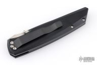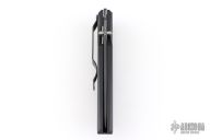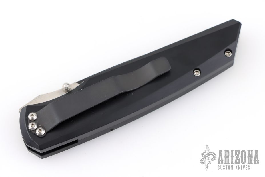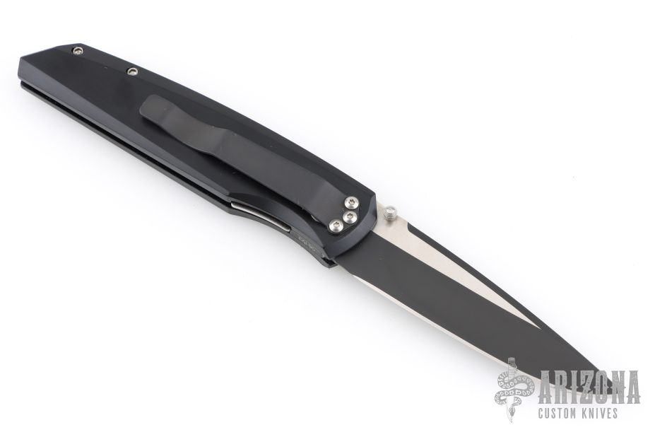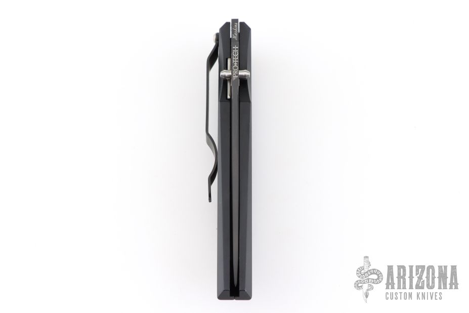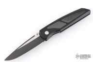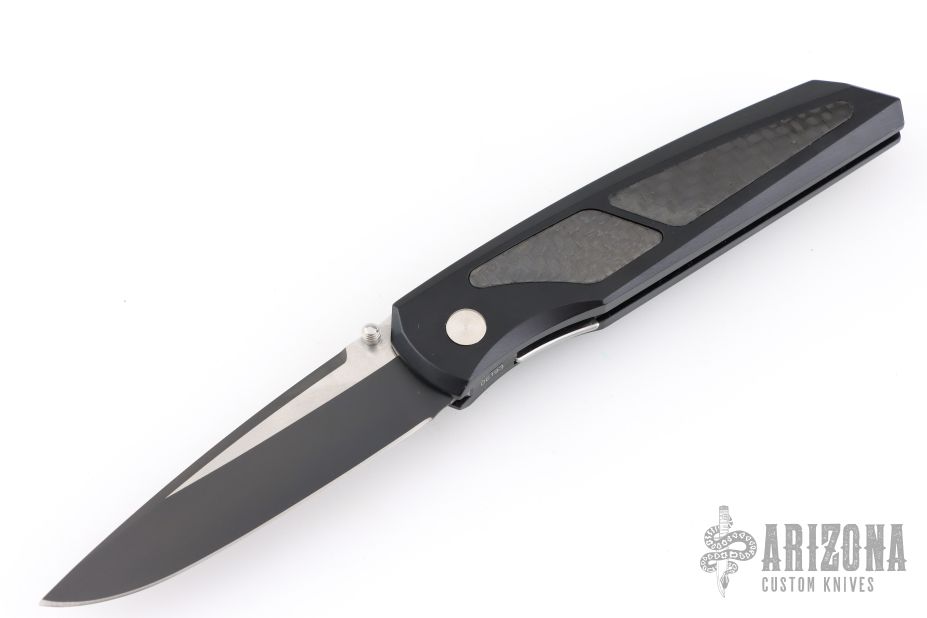 Designed by Jeff Harkins and made by Pro-Tech, this is a terrific D/A folder. The auto fire feature is achieved by depressing the lower corner of the first (closest to front of the handle) carbon fiber inlay. It opens fast, locks up well. Manual opening is equally effective, and with dual thumbstuds can be accomplished with either hand. Closes via the linerlock. Two-tone blade, black aluminum frame and carbon fiber inlays with a black tip down stainless steel clip. 06193.