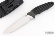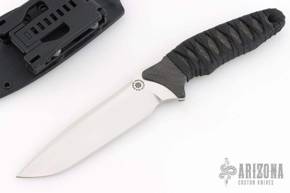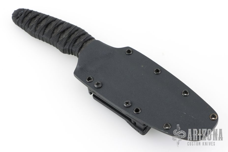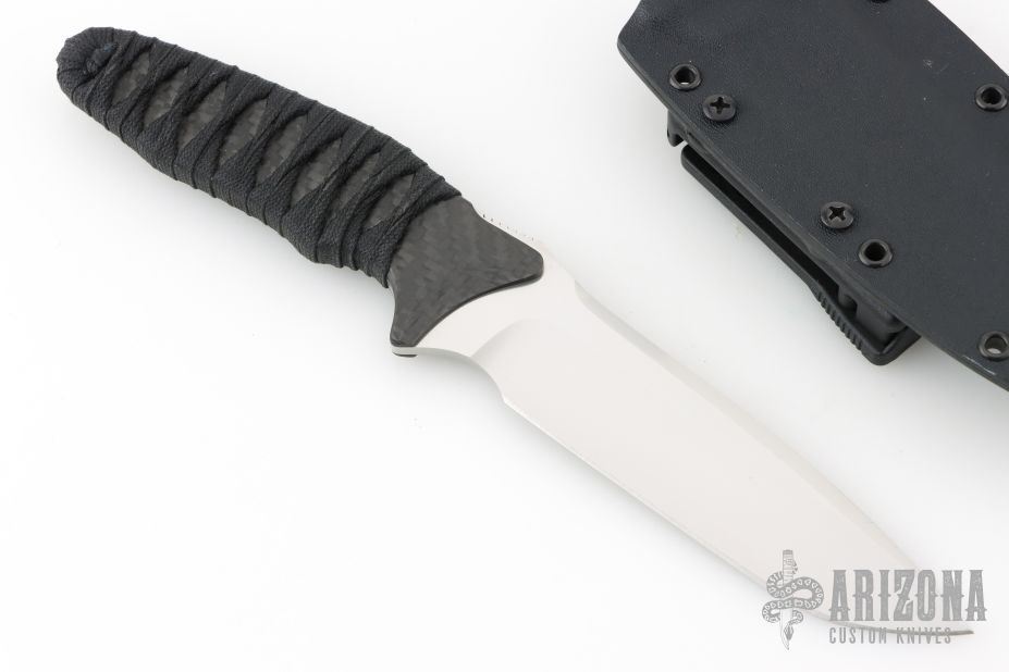 This knife by David Mosier features a hand rub satin finished blade with notched thumb ramp, false top edge, .153" blade stock and 1.25" blade depth, hidden tang construction with carbon fiber scales and black wrap. Comes with a kydex sheath with TekLok. Excellent condition.