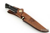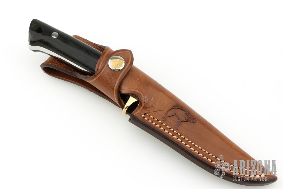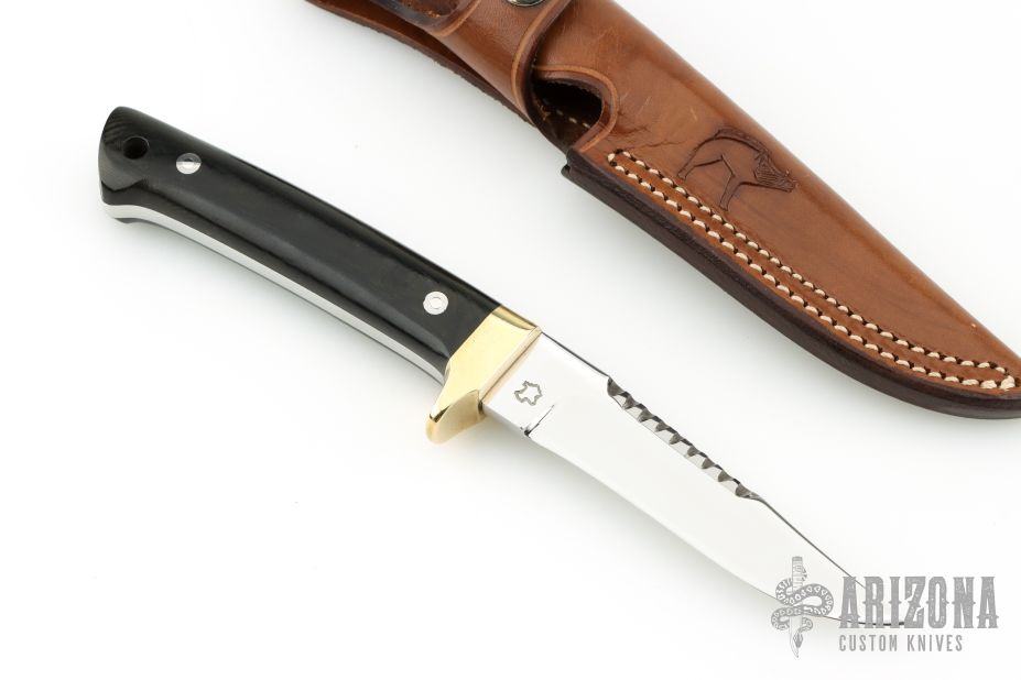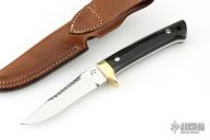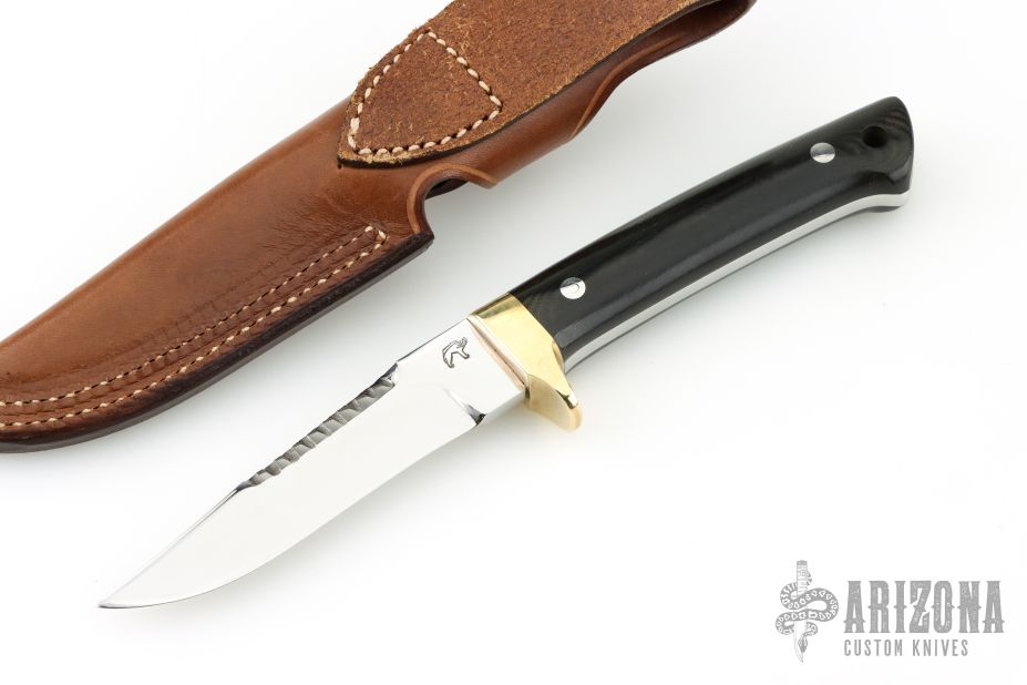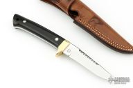 This Rieze II Prototype by Jean Tanazacq features a mirror finished blade with serrated top edge, .190" blade stock and .882" blade depth, full tang construction. The handle has polished brass guard, black linen micarta scales, lanyard hole in the butt. Comes with a brown leather sheath with hand tooled wild boar on the front. Excellent condition. Comes with COA dated 4/18/1998