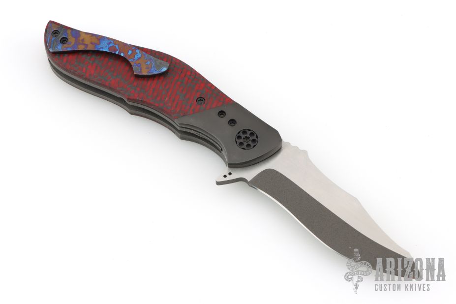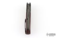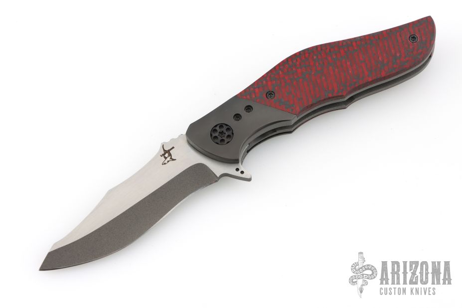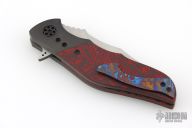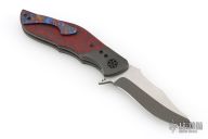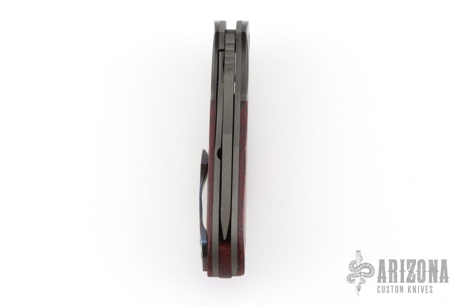 This Endorphin from Greg Lightfoot features a two-tone finished re-curved style blade. The handle has zirconium bolsters with black titanium pivot, red Zirk Carbon scales, blasted titanium liners and a mokuti tip up clip. Rides on bearings, nice blade seating, detent, and lockup. Comes with a hard case and COA dated August 2019. Excellent condition.