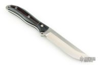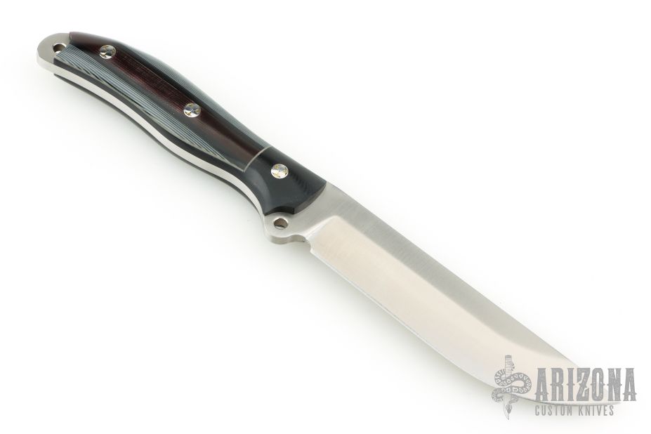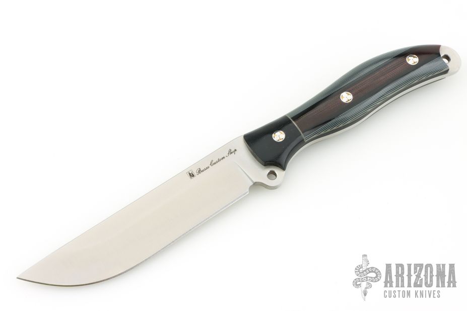 This Trail Beacon by Busse Custom Shop features a satin finished blade with .192" blade stock and 1.135" blade depth, full tang construction. The handle has black G-10 bolsters and liners, multi-color G-10 striped scales with grey liners and mosaic pins. New from maker!