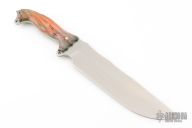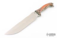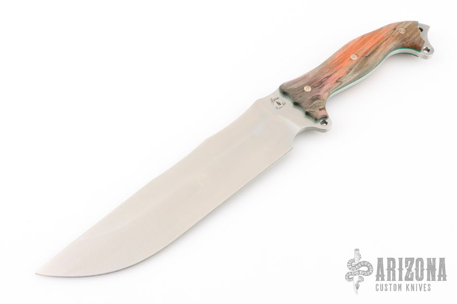 This Custom Shop Anorexic Fusion Battle Mistress by Busse features a satin finished blade with .212" blade thickness and 2.222" blade depth, full tang construction. The handle has dyed spalted maple scales with mosaic pins and green liners. New from maker!