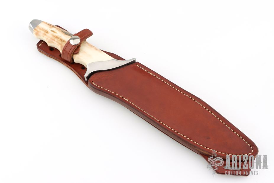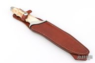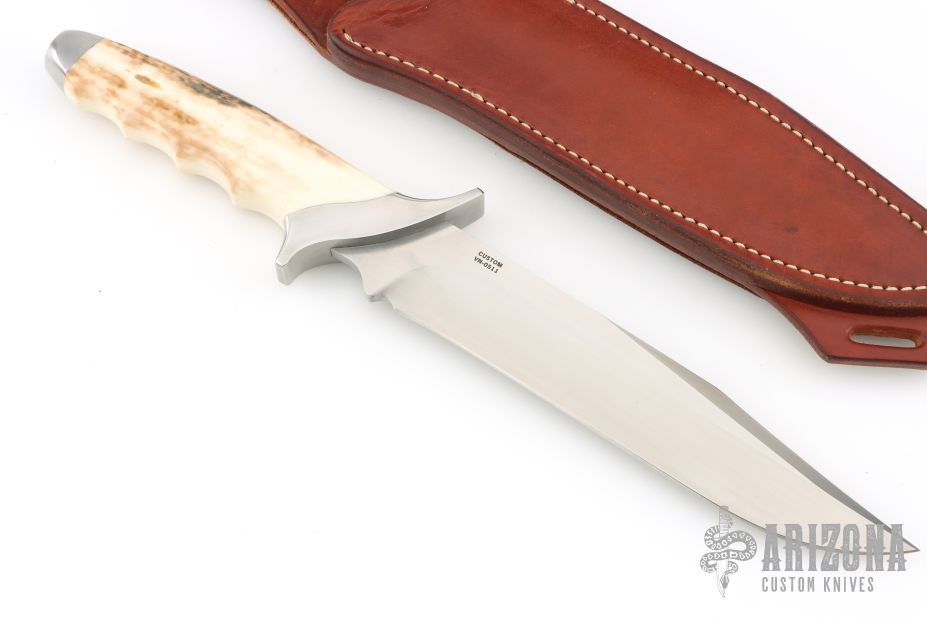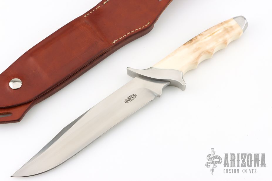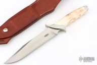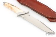 This Custom Special Forces Bowiw by Vaughn Neeley features a hand rub satin finished blade with false top edge, .247" blade stock and 1.460" blade depth, hidden tang construction with curved steel guard/pommel and fossil walrus ivory grip. Comes with a brown leather sheath with sharpening stone hidden in rear panel. Has a couple light scratches, excellent condition.