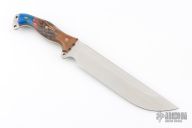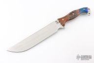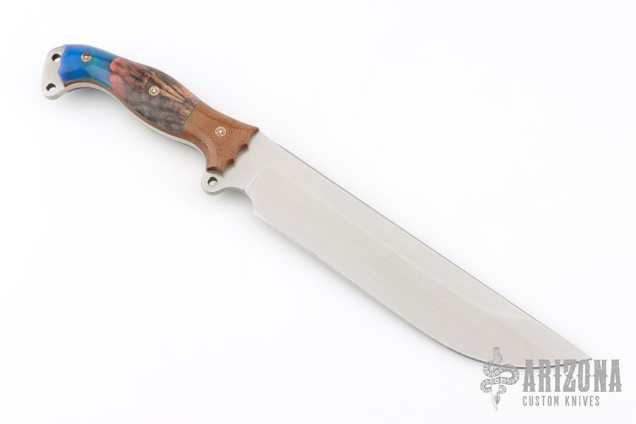 This Custom Shop Nano Fusion Camp Mistress by Busse Combat Knife Company features a satin finished blade with .211" blade stock and 1.772" blade depth, full tang construction. The handle has brown canvas micarta bolsters and liners, dyed and stabilized maple wood scales with grey liners and mosaic pins. Exposed tang pommel with lanyard hole. New from maker.