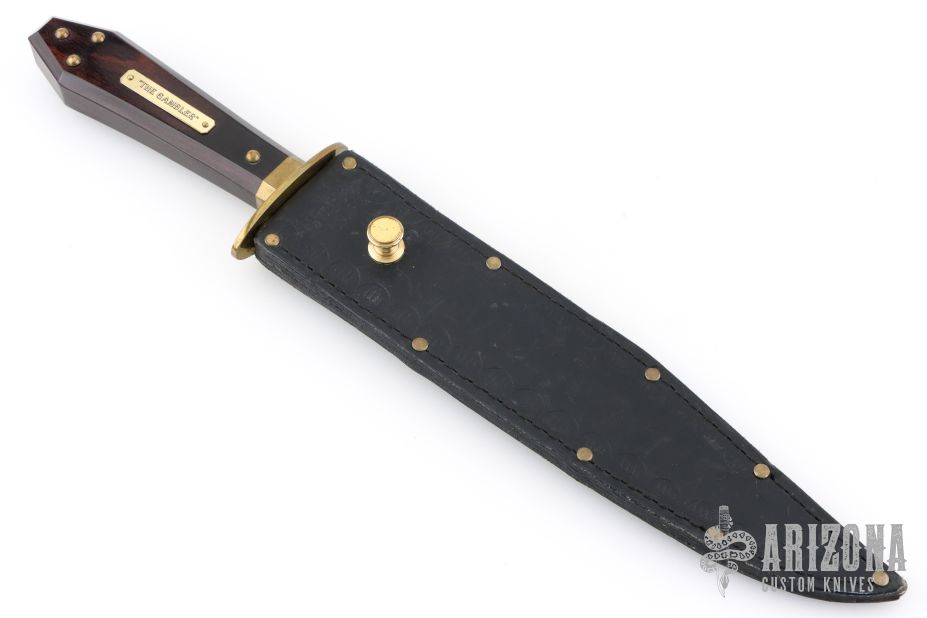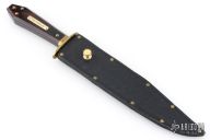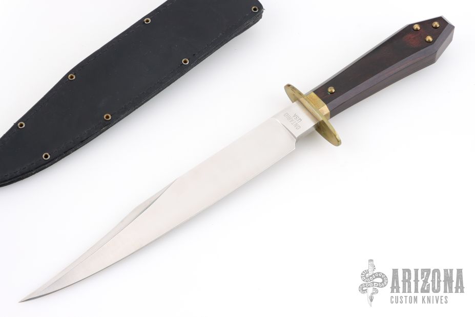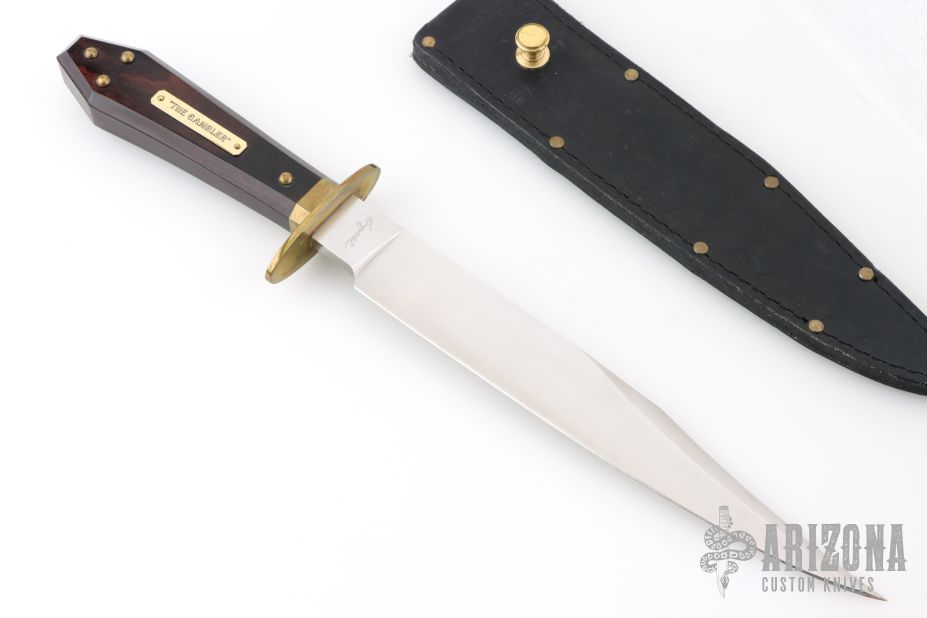 This is a discontinued Bill Bagwell designed Gambler Bowie, made by Ontario Knife Company. Features a satin finished clip point blade with a sharpened top edge, .291" blade stock and 1.230" blade depth, hidden tang construction. The handle has a brass guard/collar/studs, and a dymondwood grip. Includes original black leather sheath. Has some light patina, excellent condition otherwise.