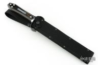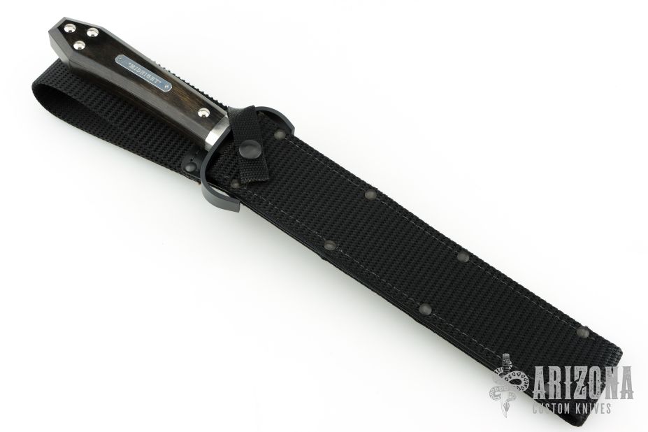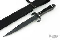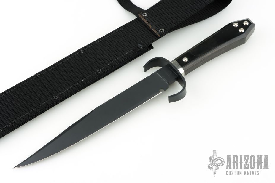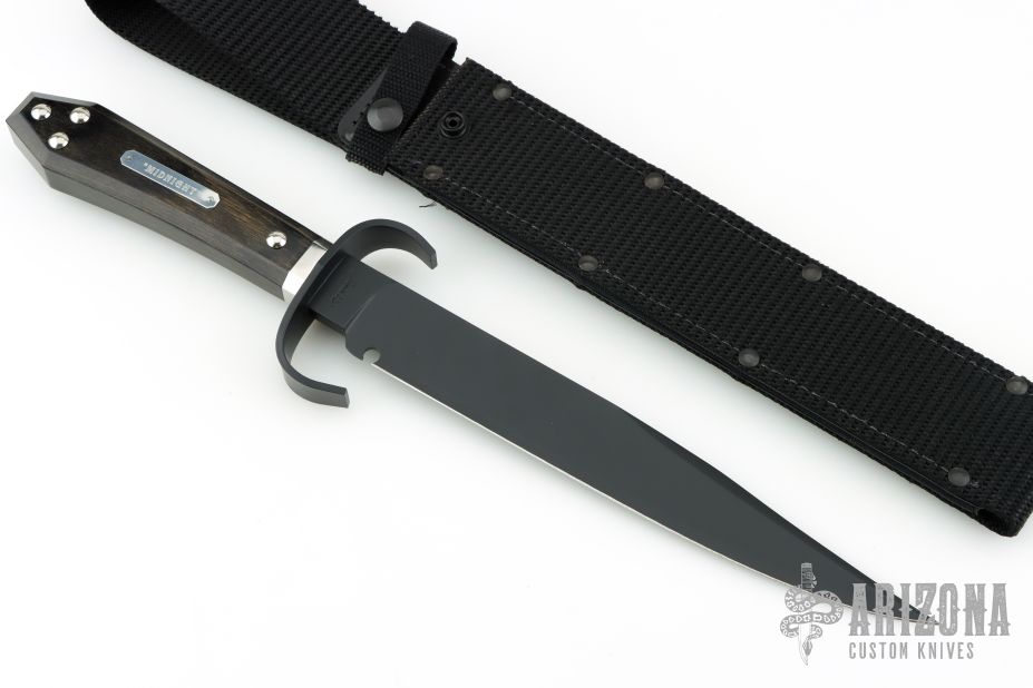 This is a discontinued Bill Bagwell designed Bowie, made by Ontario Knife, features a black coated blade with false top edge, .313" blade stock and 1.369" blade depth, hidden tang construction. The handle has a black stainless steel guard, wooden coffin shaped handle with nameplate. Comes with original box and black nylon sheath. New condition. New old stock.