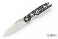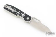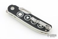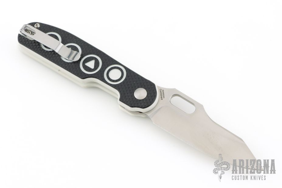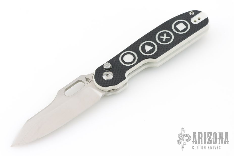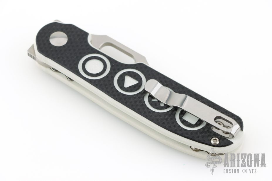 - Video game button textured black and white G-10 handle scales.