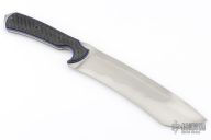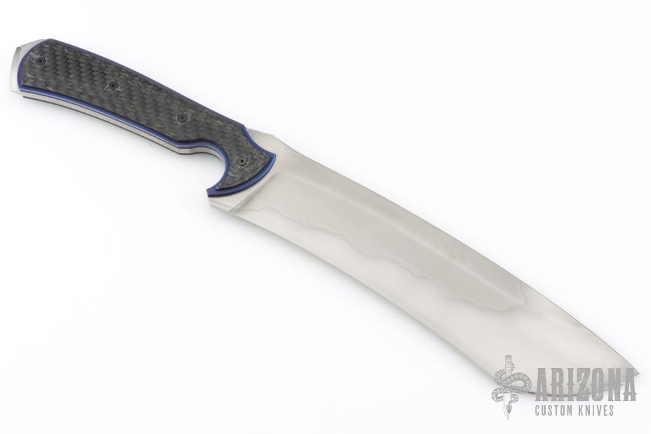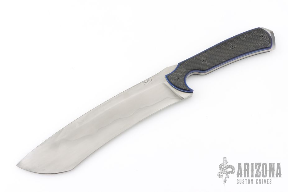 This Chopper by Doc Shiffer features a hand rub satin finished blade with hamon and notched thumbrest, .195" blade stock and 2.232" blade depth, full tang construction. The handle has carbon fiber scales with anodized titanium liners. Comes with a zippered case. Excellent condition.