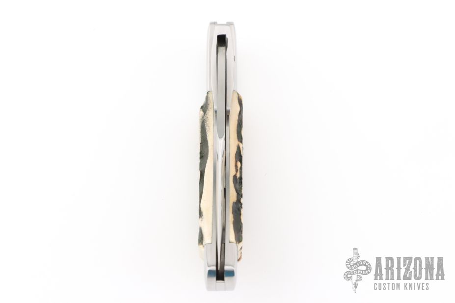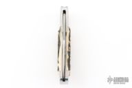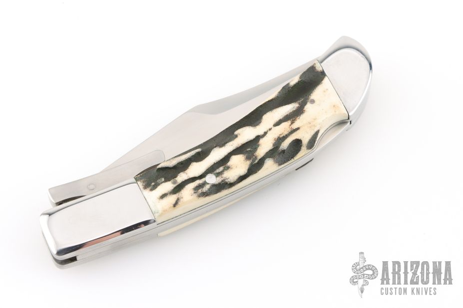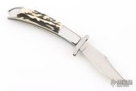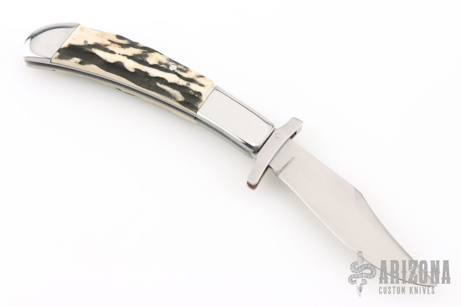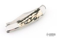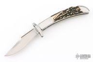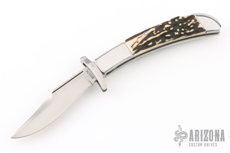 This lockback by Phil Booth features a hand rub satin finished clip point blade with false top edge, long pull nail nick, and polished steel swing guard. The handle has polished steel bolsters, front and rear, pinned stag scales, steel liners and back spring. Comes in a soft sleeve. Has some light scratches, otherwise excellent condition.