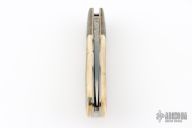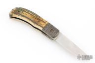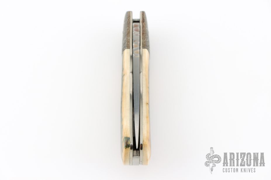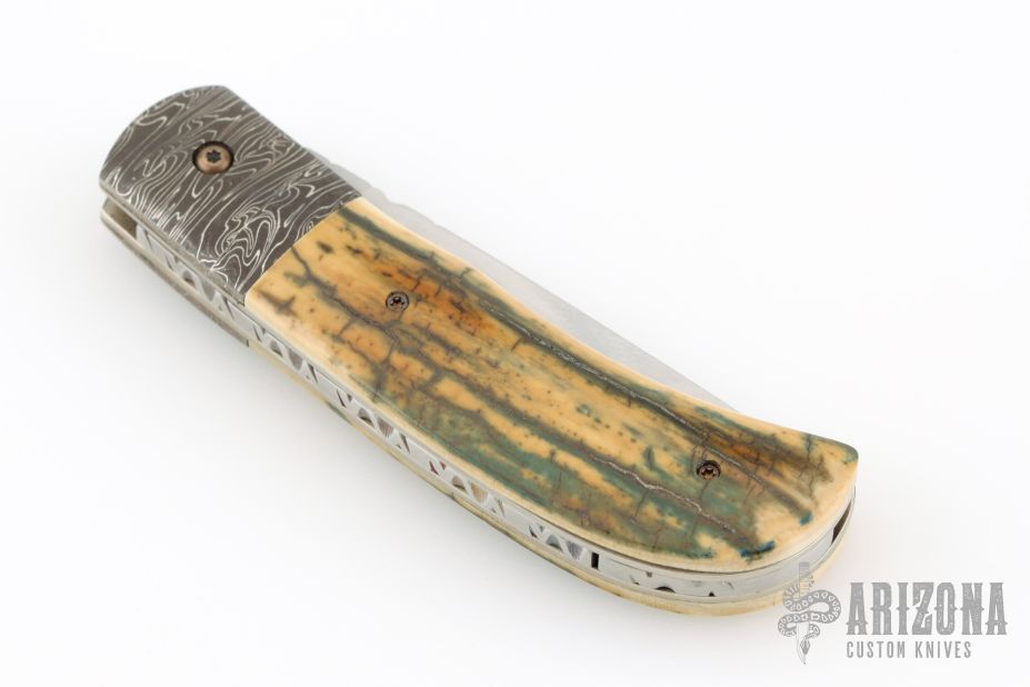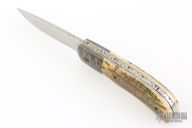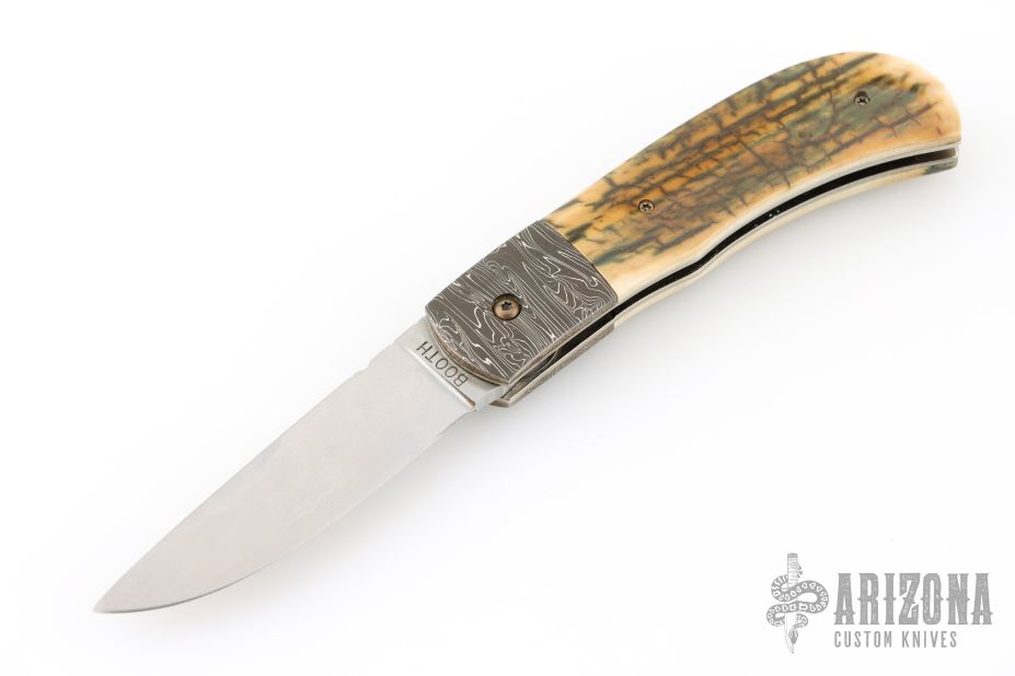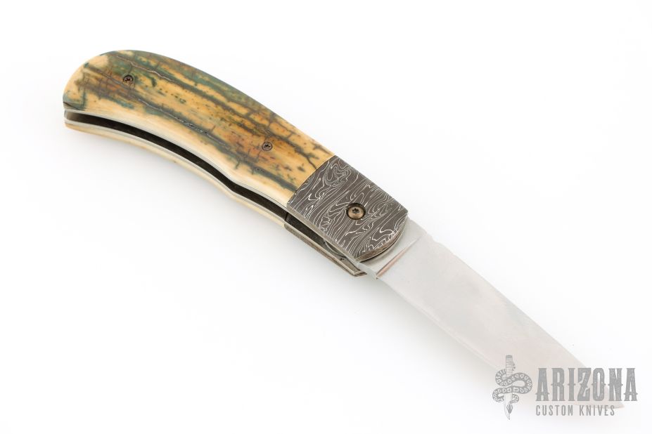 This Scale Release Auto by Phil Booth features a hand rub satin finished drop point blade with file worked blade spine. The handle Damascus bolsters, heirloom fit fossil mammoth ivory covers, file worked spring, satin finished liners. Nice lockup, action and blade seating. Comes with a soft pouch. Excellent condition.