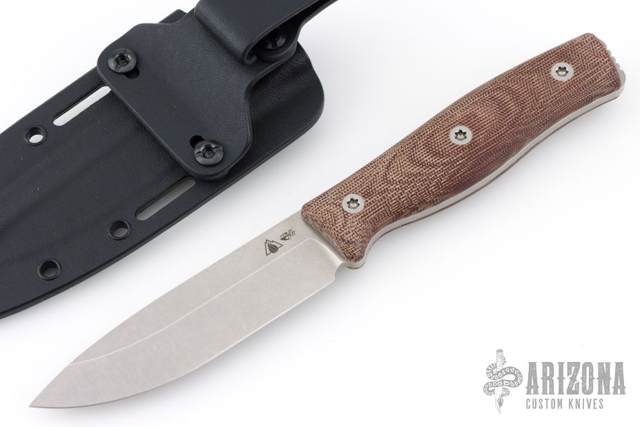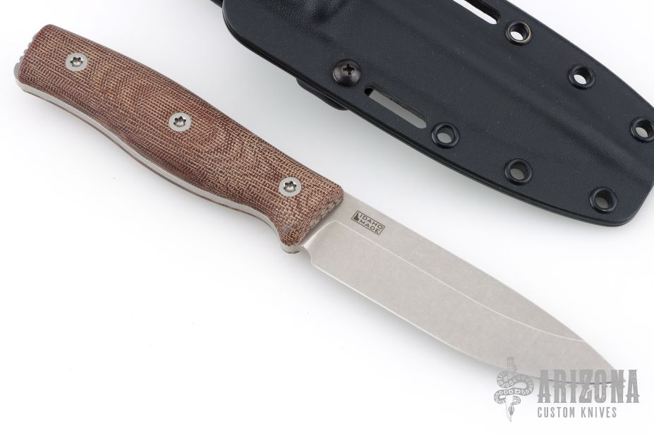 This GSO 4.5 from Survive Knives features a stonewashed drop point blade, .152" blade stock and 1.145" blade depth, full tang construction. The handle brown canvas micarta scales. Includes kydex sheath. Excellent condition.