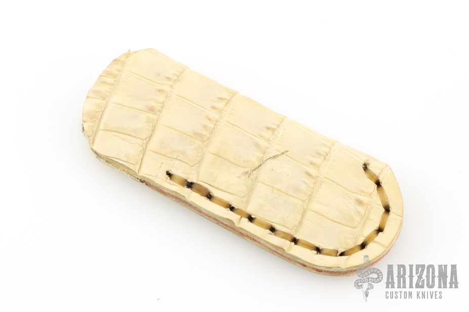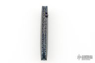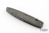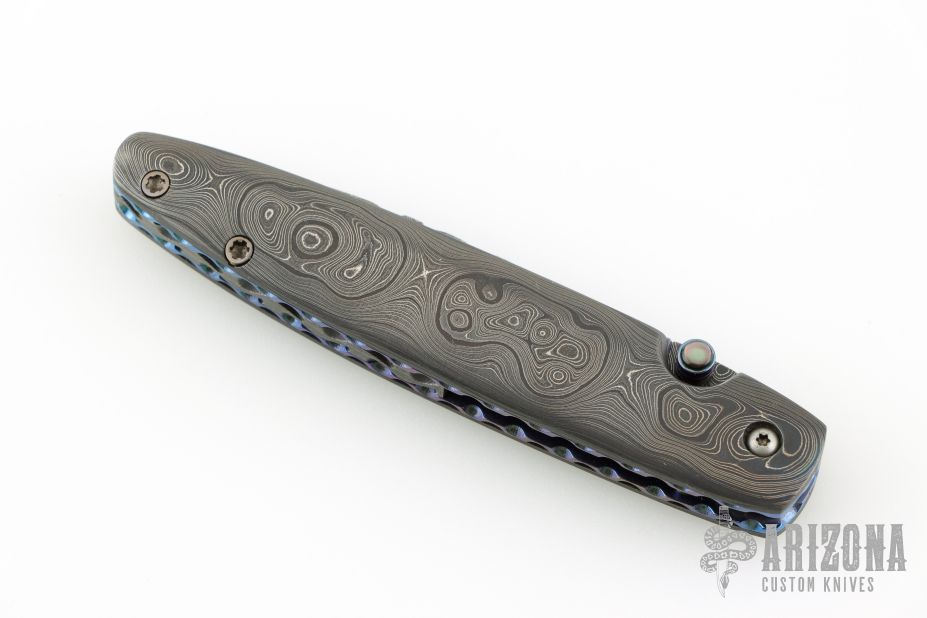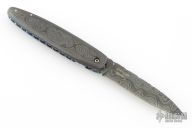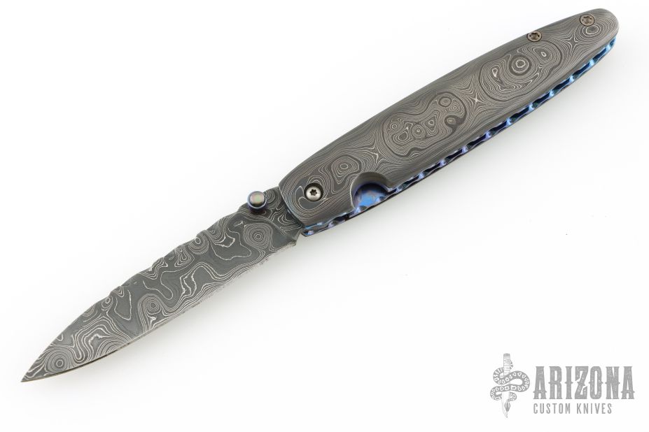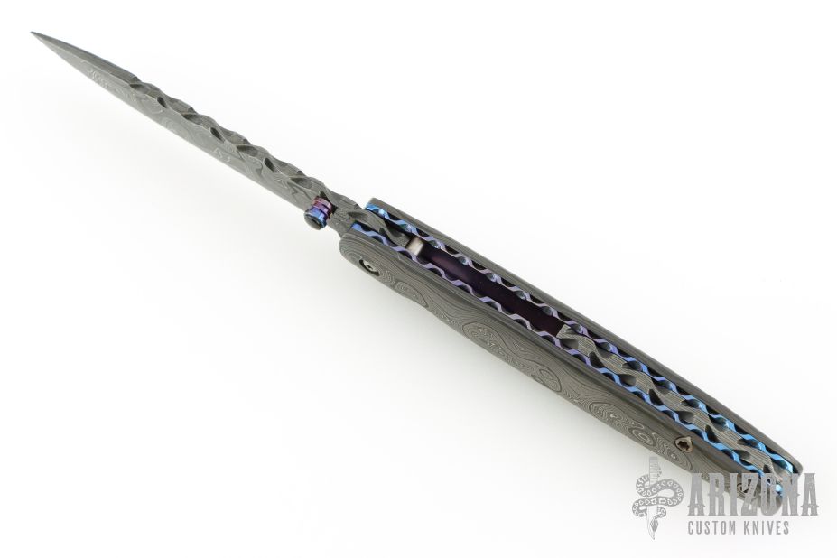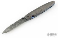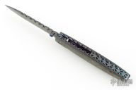 This Gent's Linerlock by Mark Nevling of Burr Oak Knives features a Damascus (320 layer Raindrop) blade with a single thumbstud with inlaid pearl, and a fileworked spine. The handle has matching Damascus scales, fileworked and anodized titanium liners, and fileworked Damascus backspacer. Comes with an albino gator leather slip sheath, a zipper case, and COA dated 3/22/03. Excellent condition.