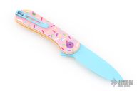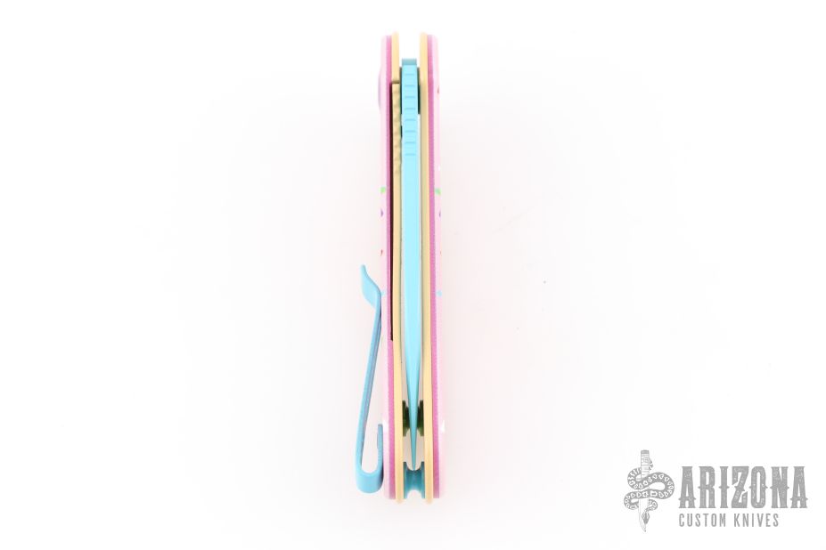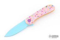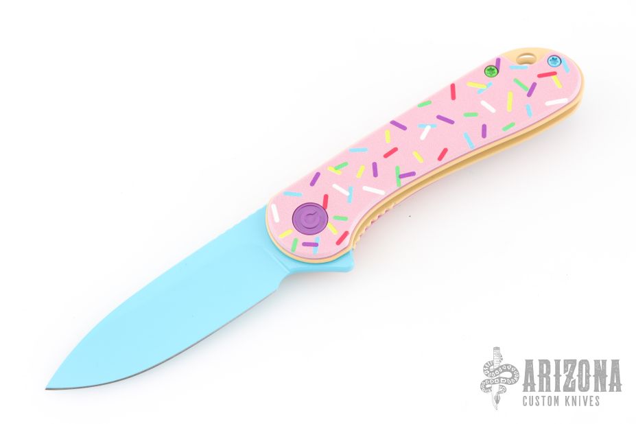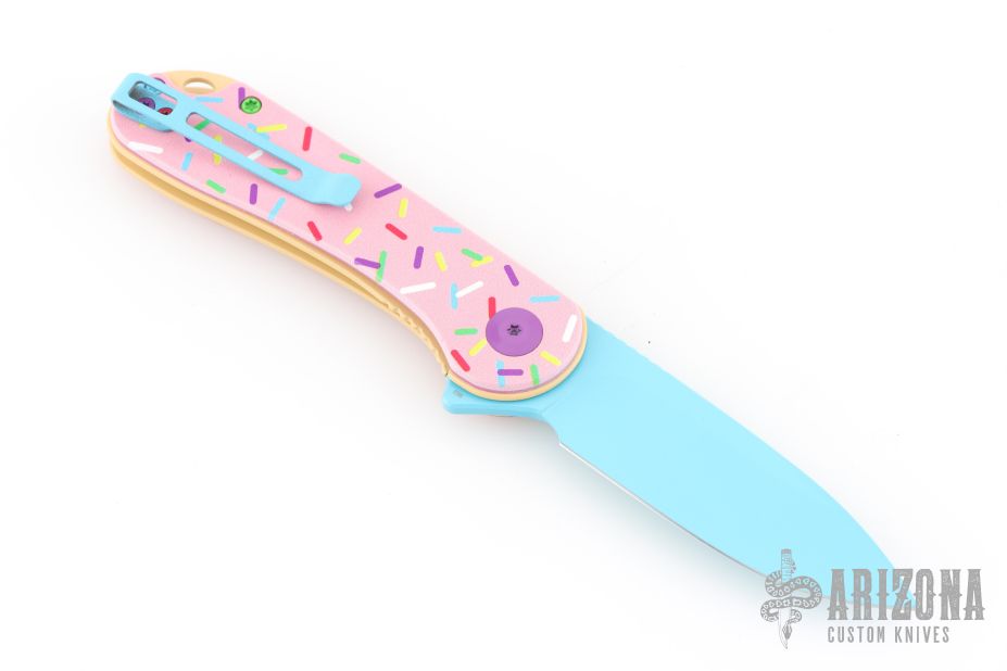- Smooth donut pink G-10 handle with multi-colored sprinkles and hardware.