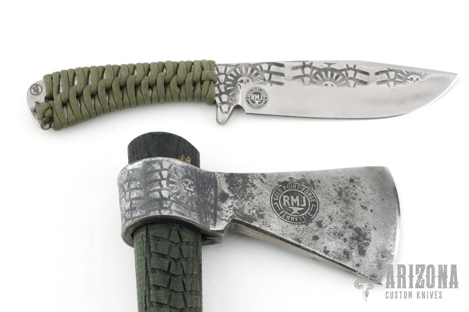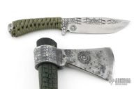 Hand forged by Ryan Johnson at the Gold Point Forge! The Death God Knife from Ryan has a near perfect balance of function and form making it a solid choice for most anything you encounter. The convex ground drop point blade profile is a great general use shape with a large belly for slicing, and features a forged Death God pattern on the blade 'flats' for some extra killer looks! The tapered tang design keeps the weight down without sacrificing strength and has been cord wrapped for a solid and secure grip without being abrasive. Comes with a custom leather sheath with RMJ embossings and OWB loop.