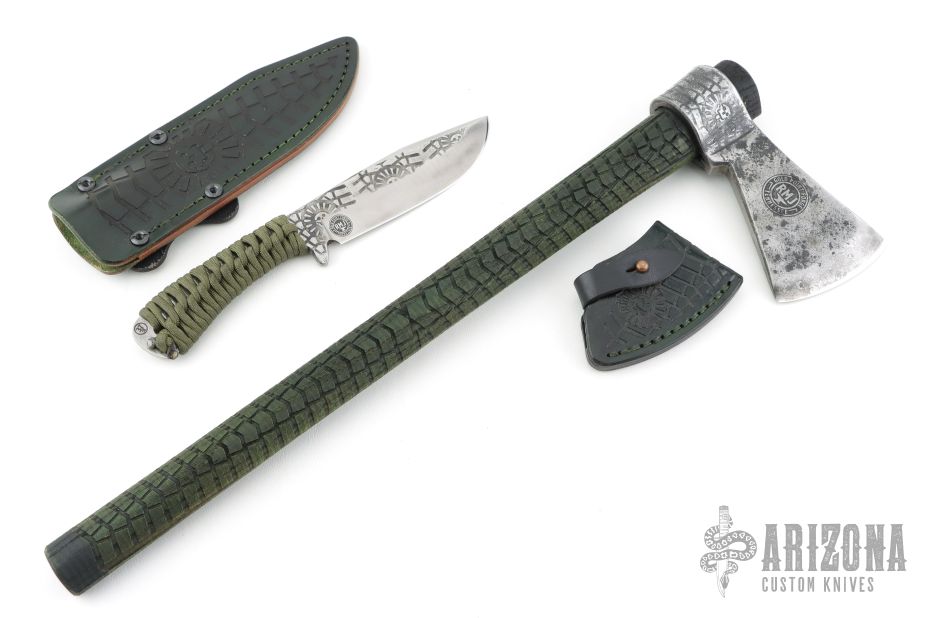 The Sheath: Top eject custom leather sheath with maker stamp and death god engravings and finished with a dark green dye.
