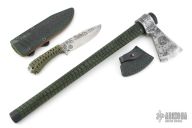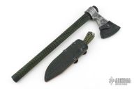 Hand forged with blood, sweat and cussin' at Ryan Johnson's Gold Point Forge! Ryan is known to have many talents: singing, world-famous Cordon bleu recipes, philanthropy (he gave Rob a job, after all), just to name a few. What you may NOT know about Ryan, is that he is an expert of beating molten hot metals into submission. A certified snake charmer of the steel, you might say. Well, every now and again, he decides to flex those honed hammering hands and create stunning pieces of usable art. This Trade Hawk is one such example! Patterned after colonial trade tomahawk designs, with his own personal blend of spices, the head can be removed from the handle for easier stowage. The head features a mild steel body with carbon steel forge welded core.
