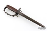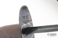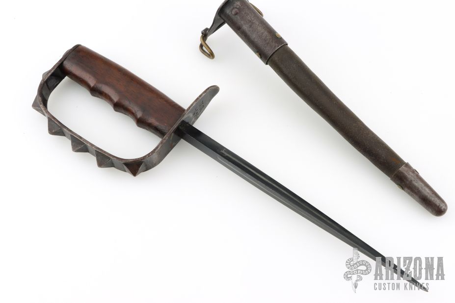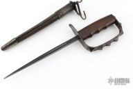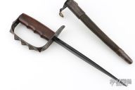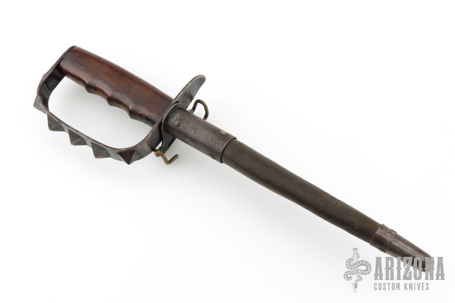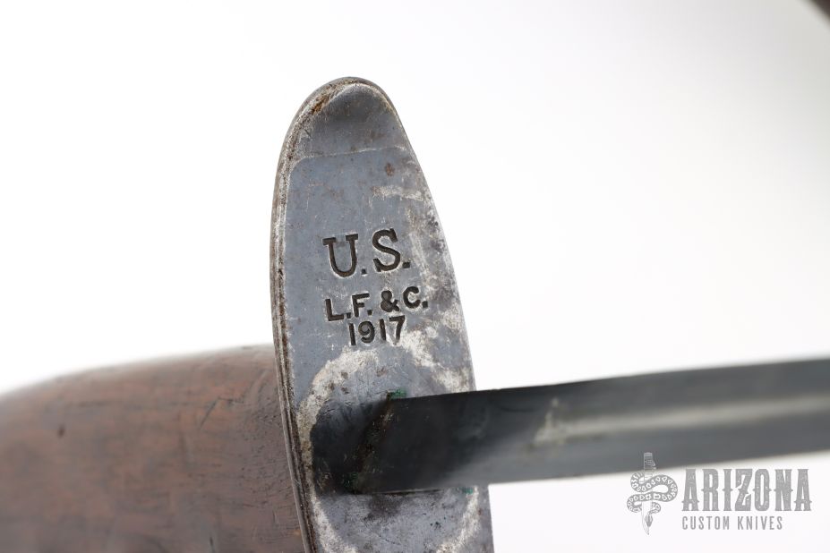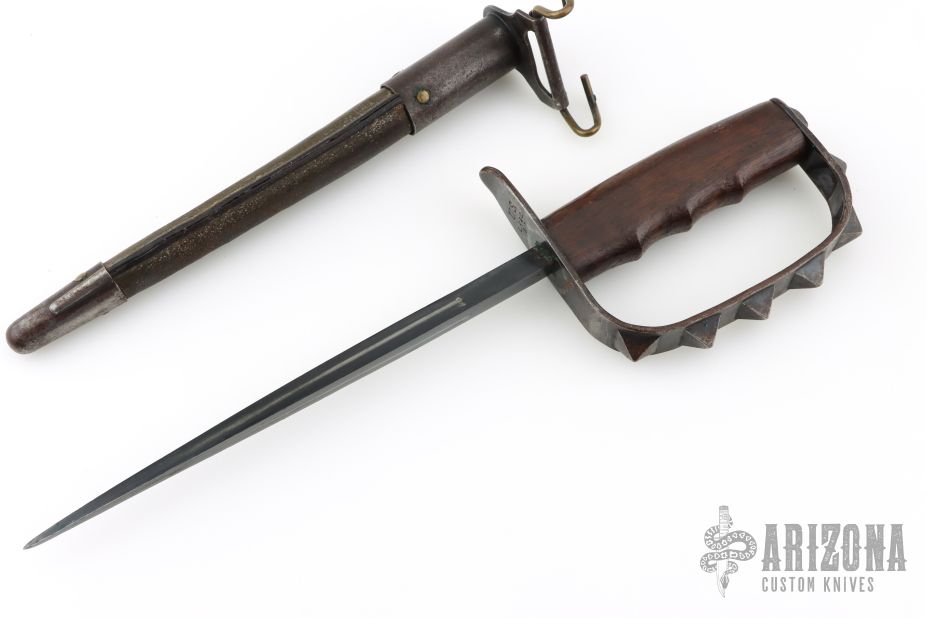 This is a 1917 L.F.&C. Knuckle Trench Knife. It has a black finished triangle dagger blade that is .569" thick at the base. The handle has a spiked/knob D-guard and a wood handle. Comes with original Jewell scabbard that is in excellent condition and dated 1918. Excellent condition for it age. Rare! Has some light scratches, dings and patina, otherwise excellent condition for its age.