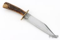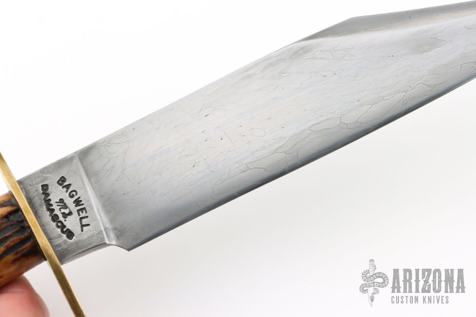 This Stag handled bowie from Master Smith Bill Bagwell features a Cable Damascus clip point blade with false top edge, .292" blade stock at the ricasso and 1.448" blade depth, hidden tang construction. The handle has a brass guard and stag grip. Has a couple light scratches, otherwise excellent condition.