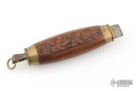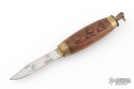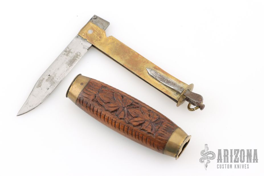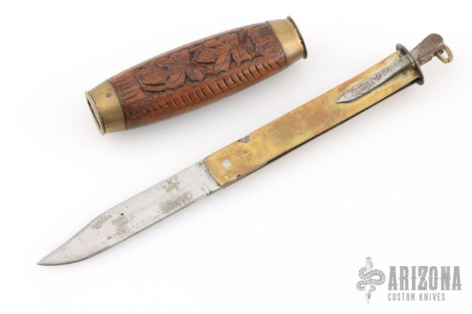 This Barrel Knife features a clip point satin finished blade. The blade sets in a brass frame that holds the blade in the open and closed positions. The handle has brass bolsters with a carved wood grip. Has scrathces and patina, otherwise good condition for its age.