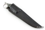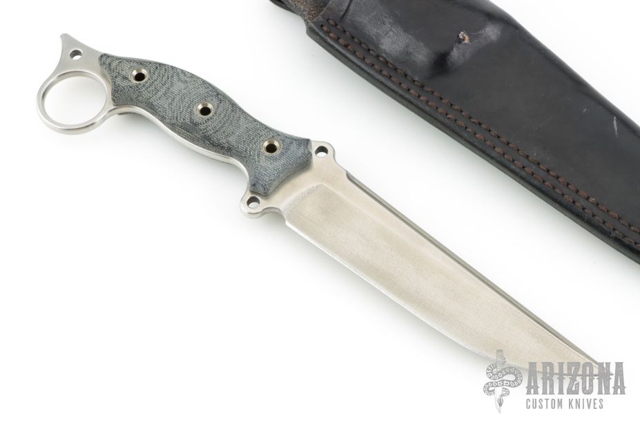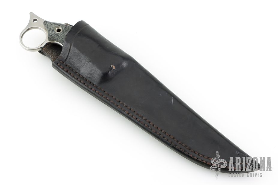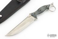 This Boarracuda Fighter by Busse features a competition finished blade with false top edge, .211" blade stock and 1.460" blade depth, full tang construction. The handle has black canvas micarta scales with extended tang and lanyard hole. Comes with a custom black leather sheath. Excellent condition.