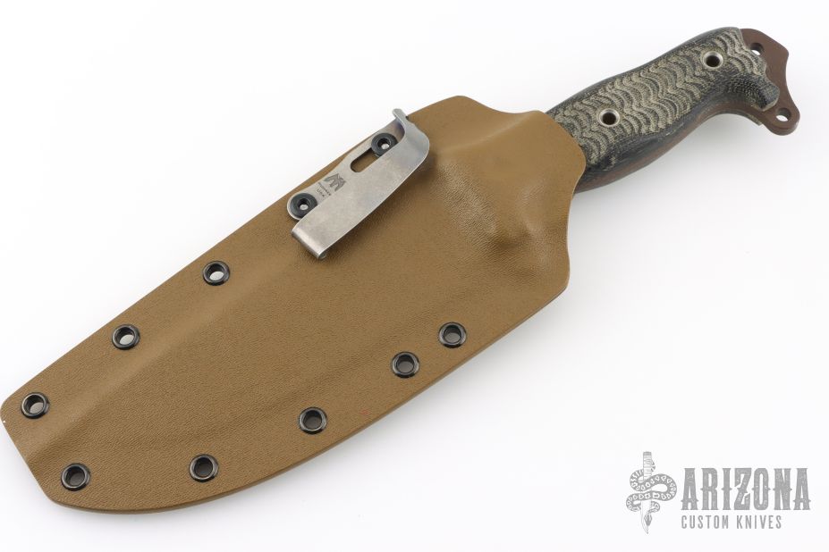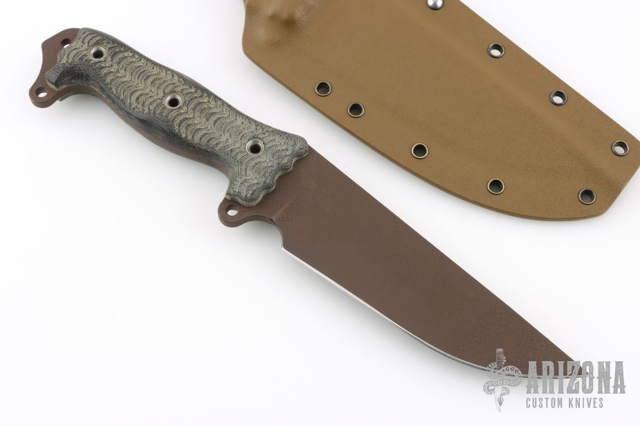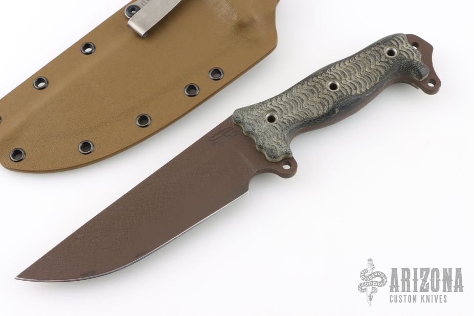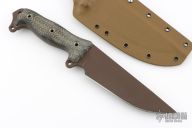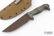 This Dirt Dart by Busse Combat features a black coated blade with .220" blade stock and 1.931" blade depth, full tang construction. The handle has black canvas micarta scales. Comes with a custom Kydex sheath. Has some scuffs, otherwise good condition.