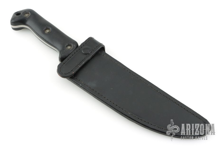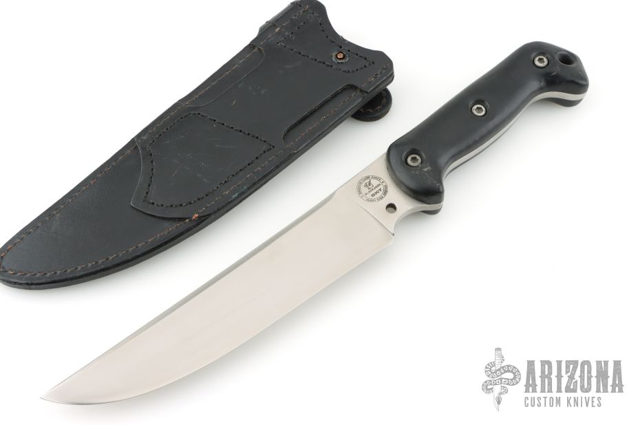 The Magnum Camp Knife is a Jerry Fisk design by Blackjack and Becker Knife and Tool. It has a satin finished blade with .210" blade stock and 1.717" blade depth, full tang construction. The handle has black composite scales. Comes with original black leather sheath. Has some light scratches, otherwise excellent condition