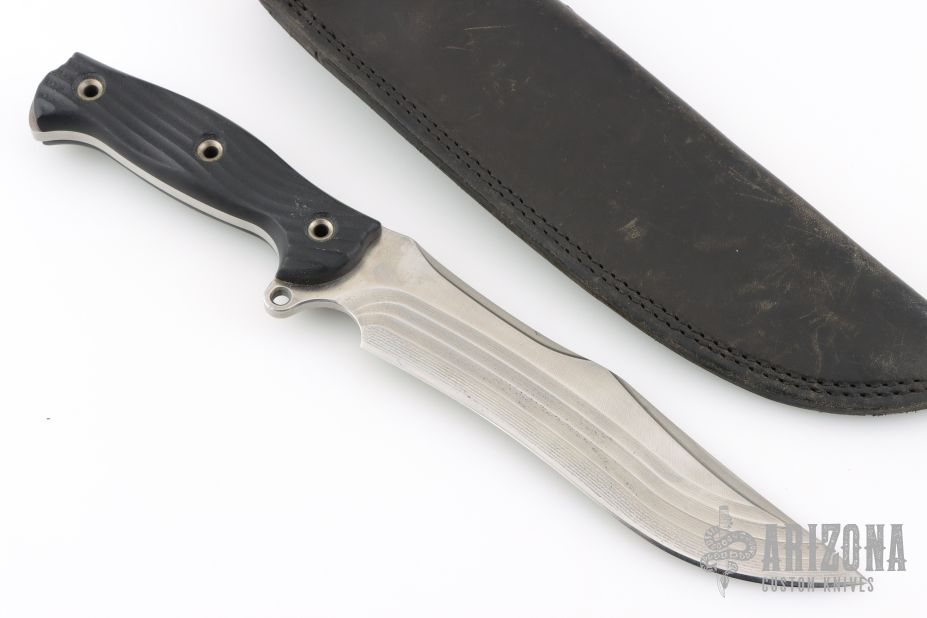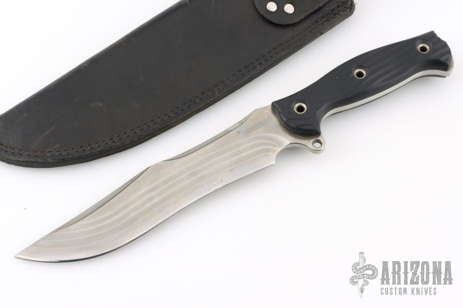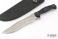 This INFI Mil Edition BURP by Busse features a competition finished blade and black G-10 scales, .212" blade thickness and 1.683" blade depth, full tang construction. Comes with a black leather sheath. Has a couple light spots on the blade, otherwise excellent condition.
