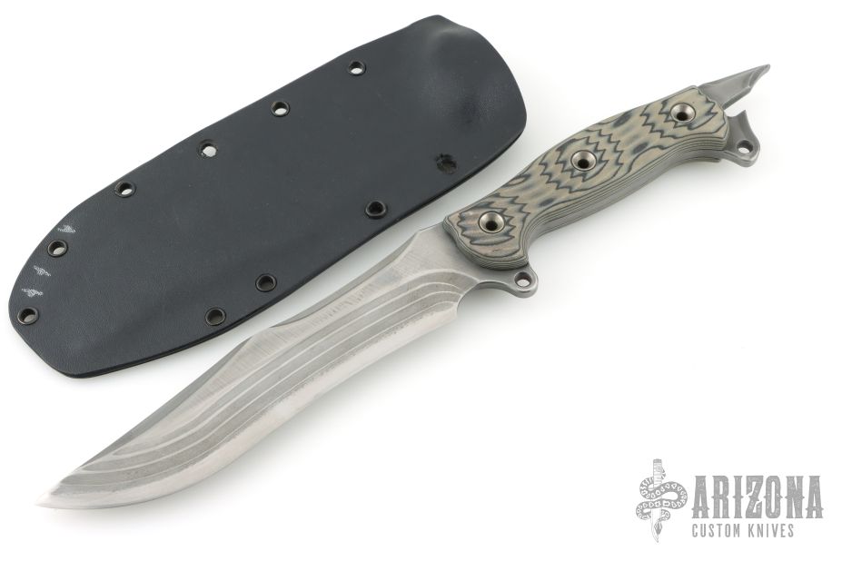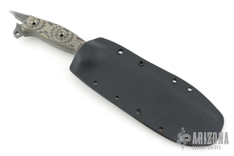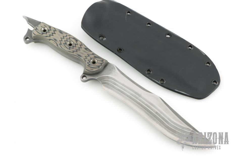 This Burp Variant by Busse features a recurve blade and black/grey G-10 scales, .211" blade thickness and 1.683" blade depth, full tang construction. Has spike and bottle opener at the butt. Comes with a kydex sheath. I believe this knife was coated, and the coating was removed, Has scuffs and scratches, has been used and sharpened, otherwise good user condition.