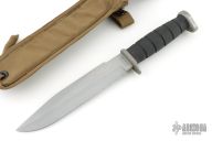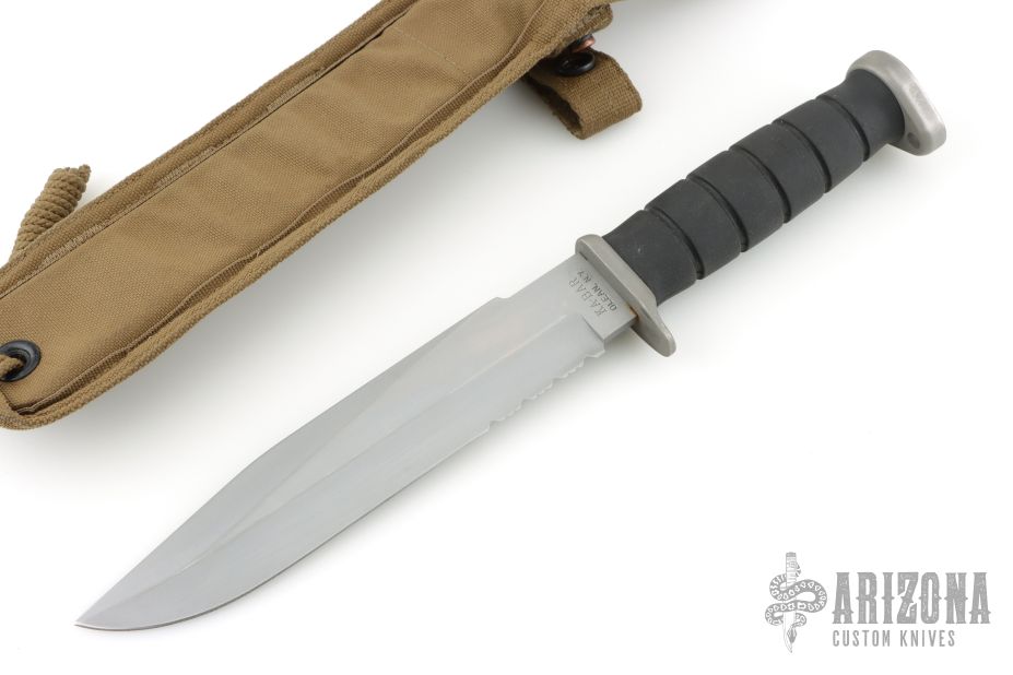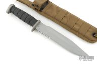 This Next Generation Fighting Knife by Ka-bar features a grey coated partially serrated blade with false top edge, .162" blade stock and 1.480" blade depth, hidden tang construction. The handle has a grey aluminum guard and butt with a black rubber grip. Comes with green nylon sheath. Has some light scratches and scuffs, otherwise good condition.