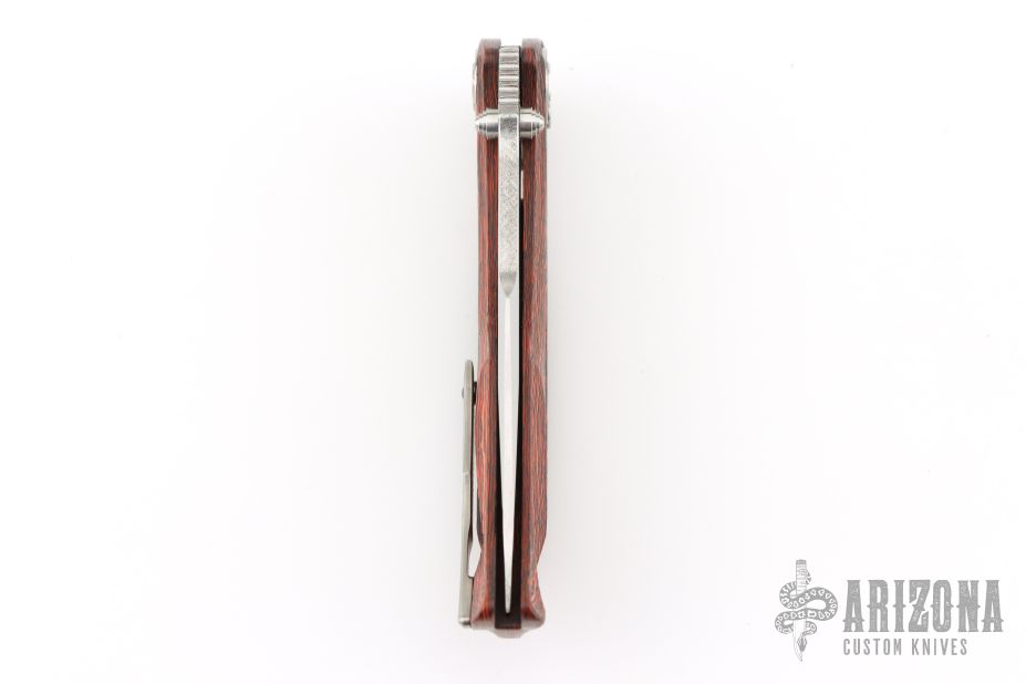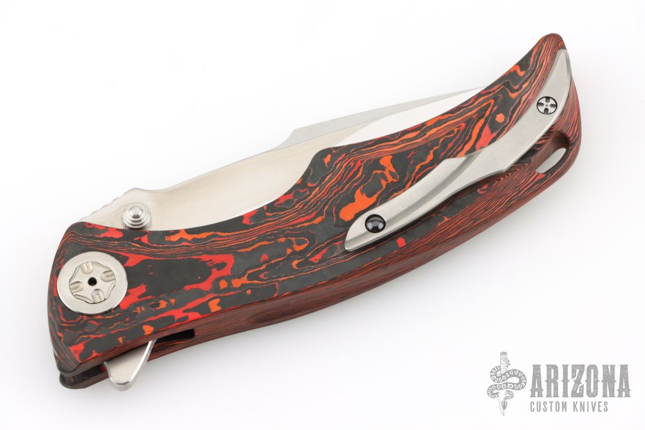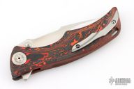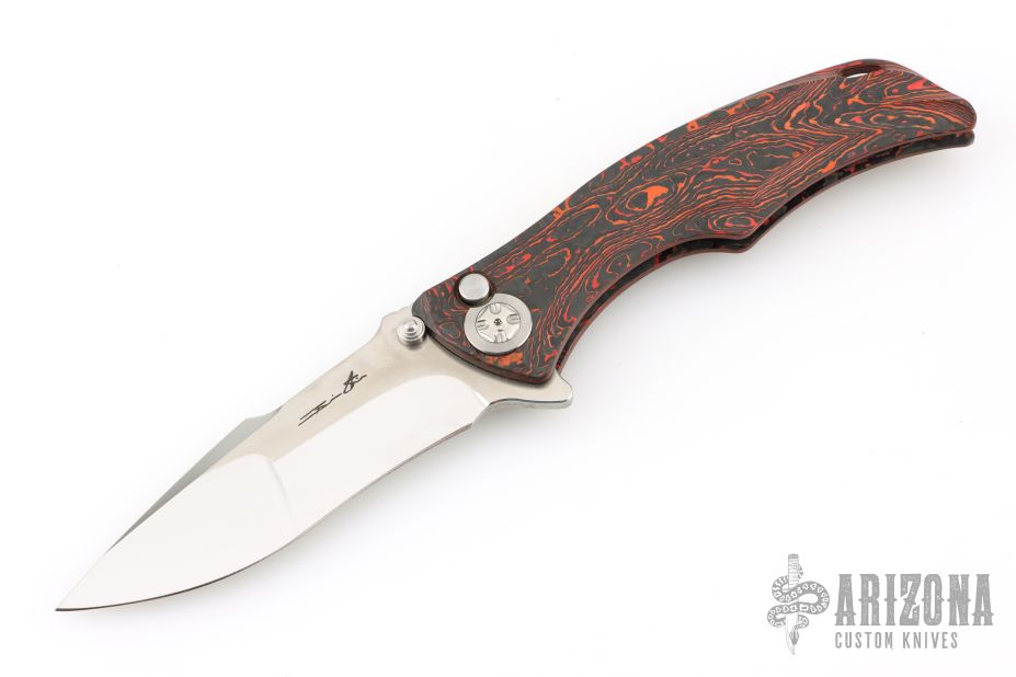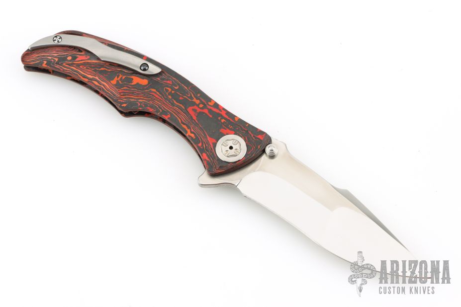 This Tighe Down Button Lock Flipper by Brian Tighe features a mirror and satin finished multi-ground blade with notched thumbrest, flipper and dual thumbstuds. The handle has an integral red/black Fat Carbon frame with a tip up satin finished titanium clip with ceramic ball inlay. Comes with a zippered case. Excellent condition.