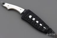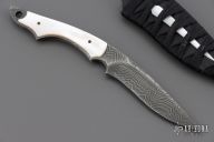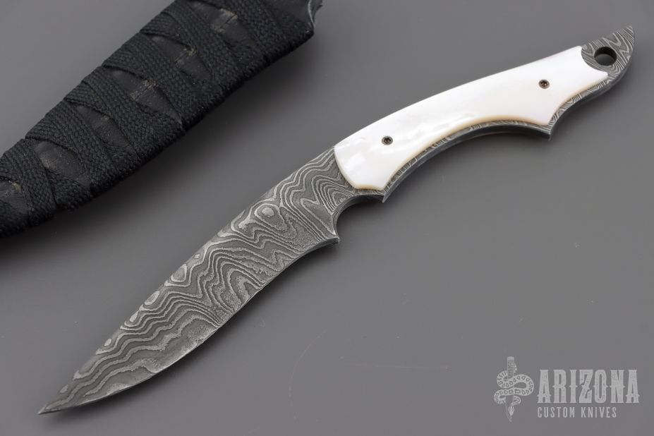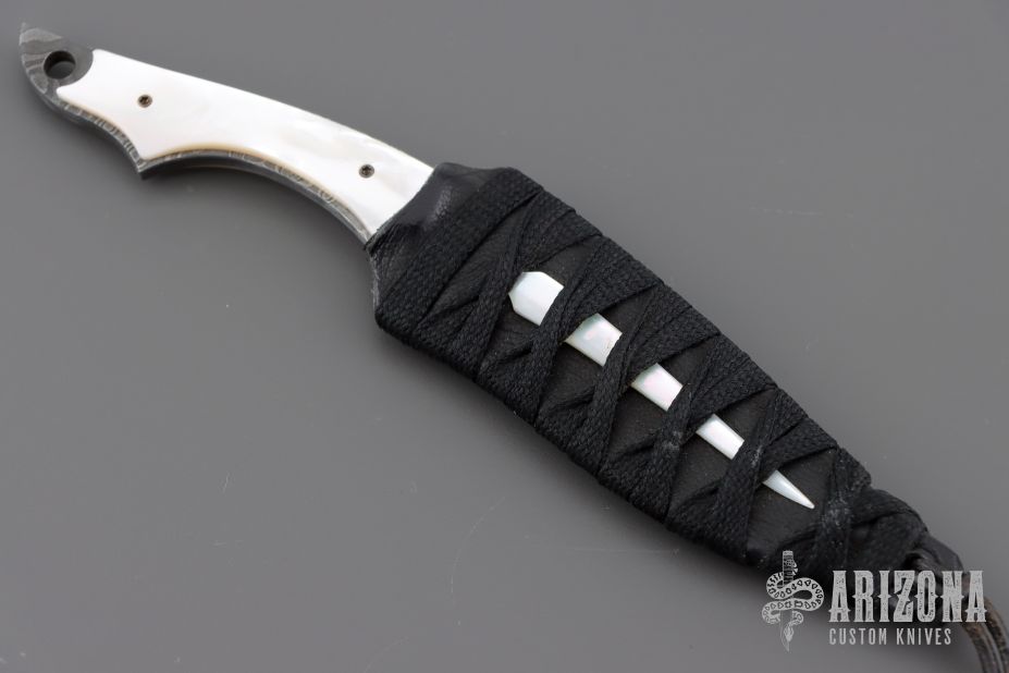 This neck knife by Stan Wilson features a drop point recurve Damascus blade with .127" blade stock and .705" blade depth, full tang construction with beautiful mother of pearl scales. Comes with a black leather neck sheath with outer wrap, and pearl inlay. Comes in a CKF zipper case. Excellent condition.