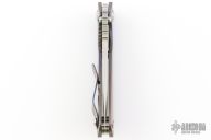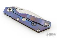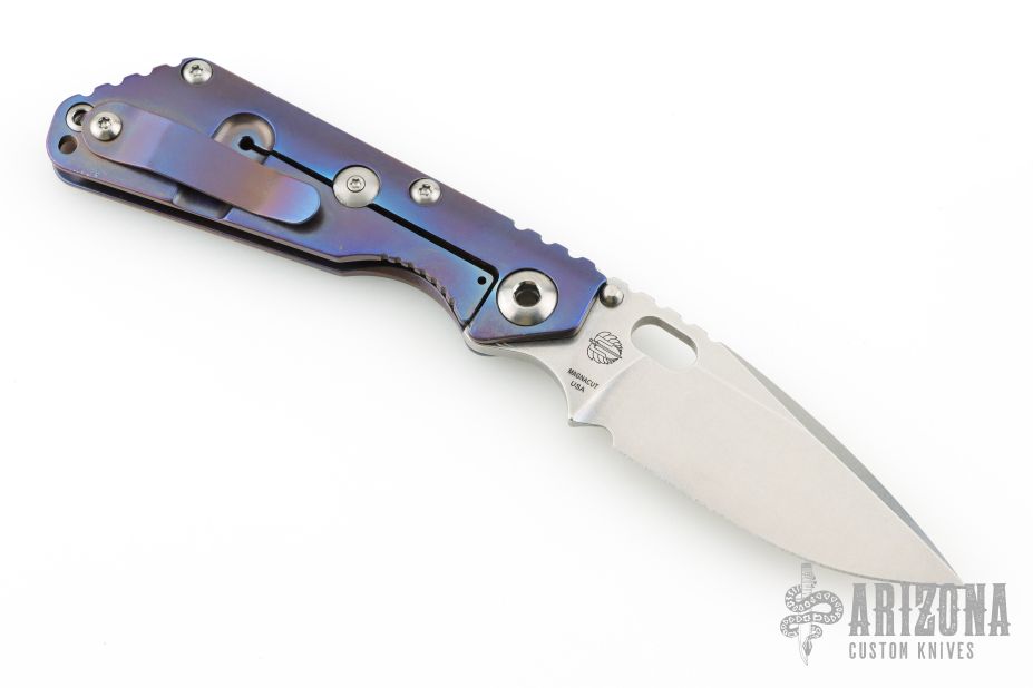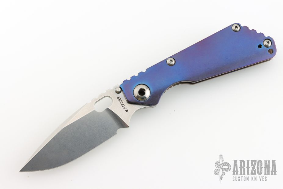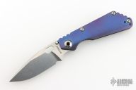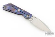 This Mick Strider Performance series SNG framelock folder features a stonewashed drop point blade with thumbhole and notched thumbrest. The handle has a stonewashed anodized titanium frame with titanium clip, tip up carry. Jimping on blade spine. Includes Hinderer "Lock Bar Stabilizer" for maximum reverse lock retention. Nice lockup, detent, and blade seating. New condition.