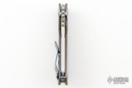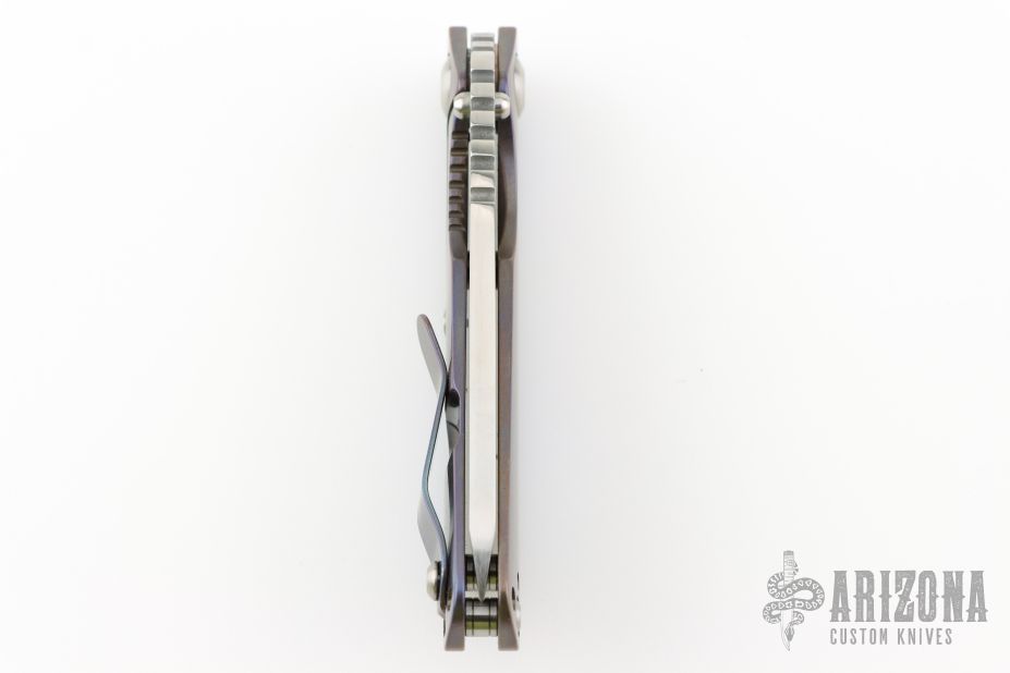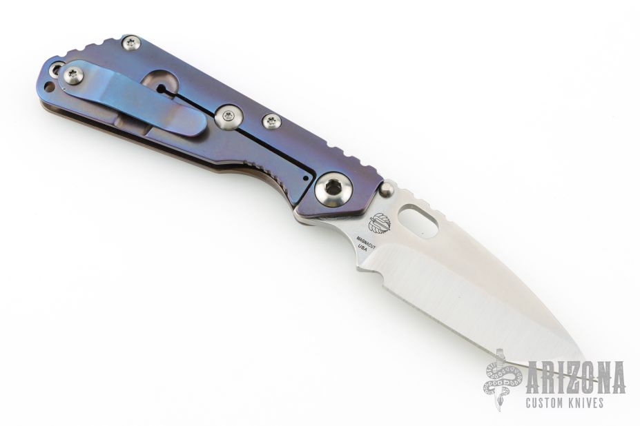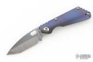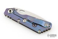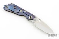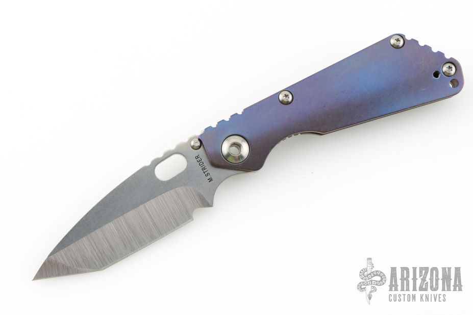 This Mick Strider Performance series SNG framelock folder features a stonewashed tanto blade with thumbhole and notched thumbrest. The handle has a stonewashed anodized titanium frame with titanium clip, tip up carry. Jimping on blade spine. Includes Hinderer "Lock Bar Stabilizer" for maximum reverse lock retention. Nice lockup, detent, and blade seating. New condition.