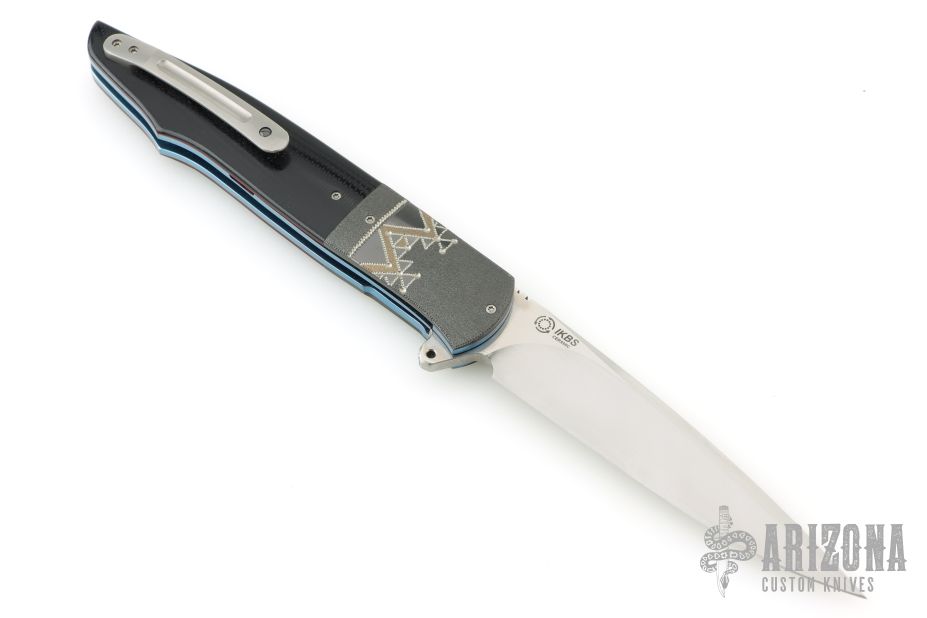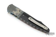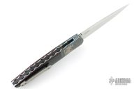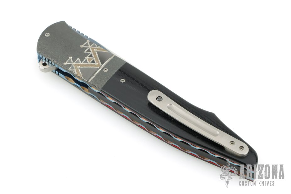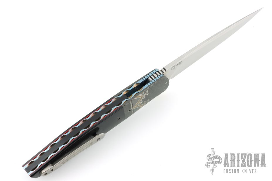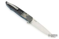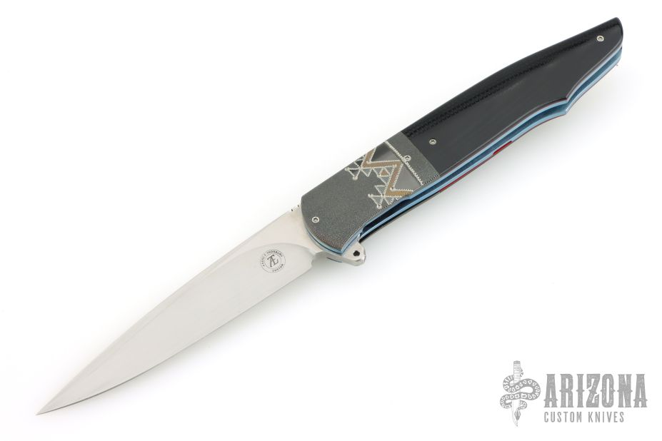 This knife by Andre Thorburn features a hand rub satin finished blade with notched thumbrest and flipper. The handle has engraved/stippled stainless steel bolsters, black G-10 scales with red liners, anodized titanium liners with vine file-worked spines, stainless steel backspacer and a tip up titanium clip. Nice detent, lockup and blade seating. Comes with nylon velcro case. Excellent condition.