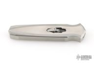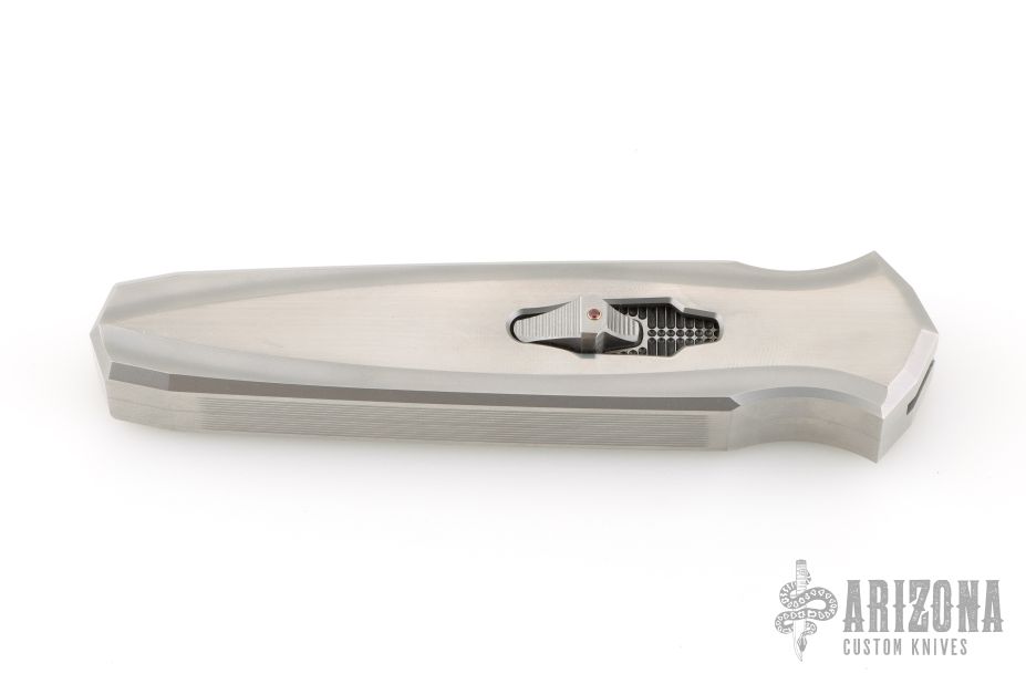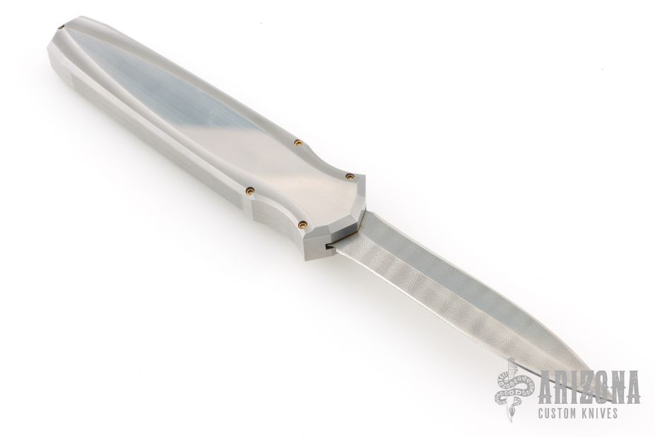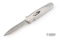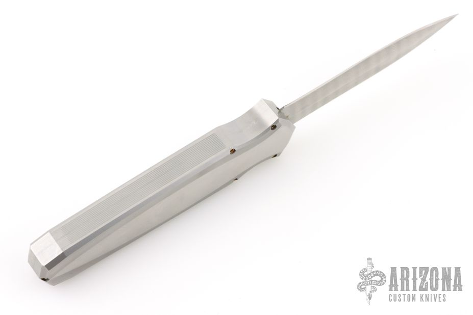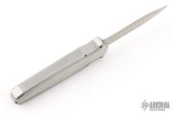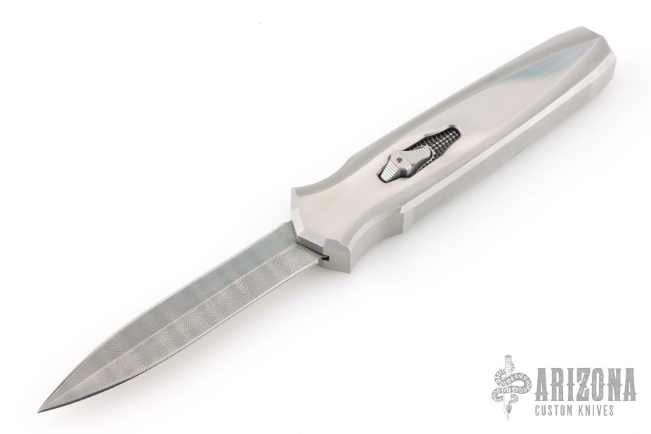 This Triton OTF Auto by Jeffrey Harkins features a Damascus double edged blade. The handle has a two tone 416 stainless steel frame with bead blast finished bevels and millings. Satin flats. Excellent work. Comes with a hard case. Has a few light scratches, otherwise excellent condition.
