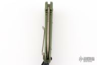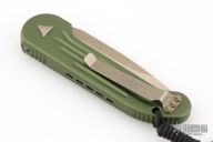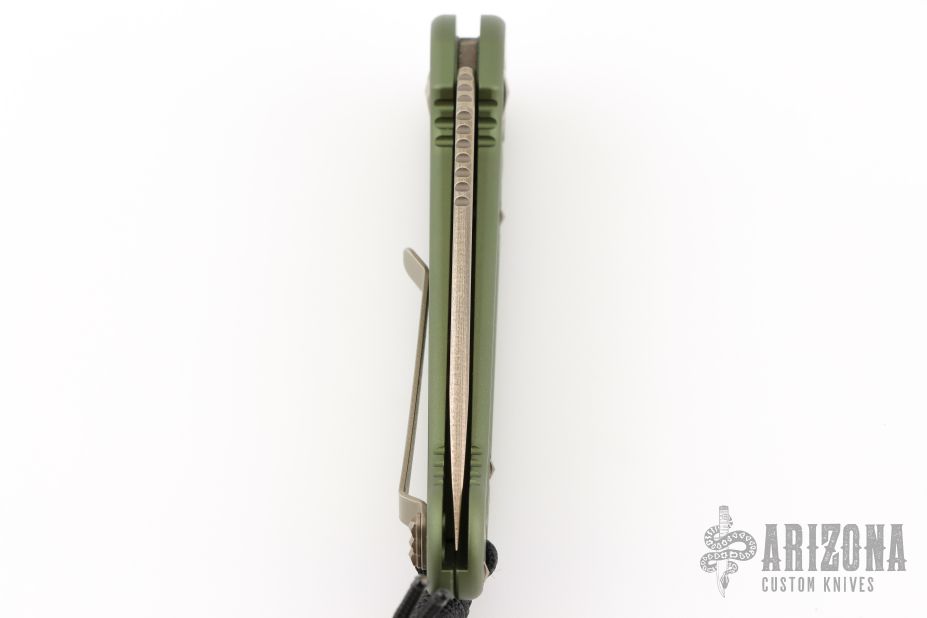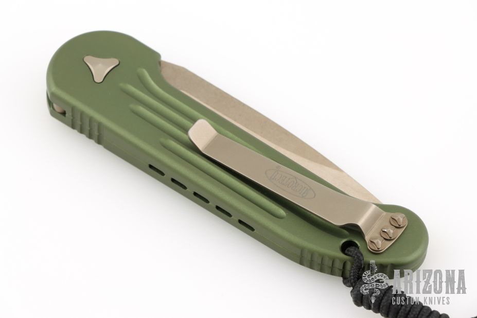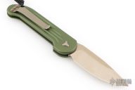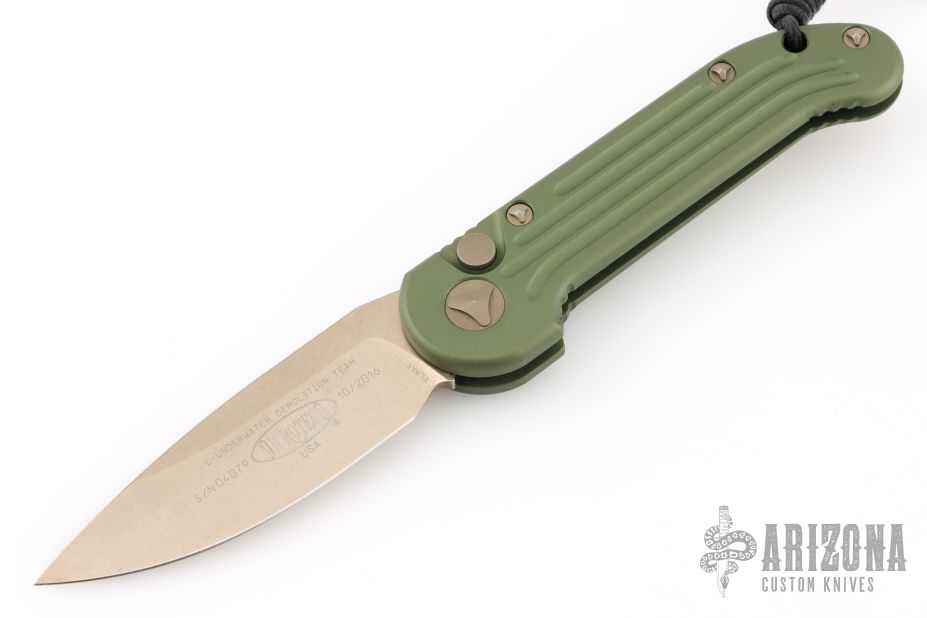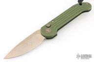 This LUDT side opening automatic by Microtech has a bronzed and stonewash finished blade with a standard edge and a contoured OD Green aluminum frame. Stainless steel clip. Dated 10/2016 and serial number 04079. Comes with original box and papers. Has a couple light scuffs, otherwise Excellent condition.