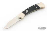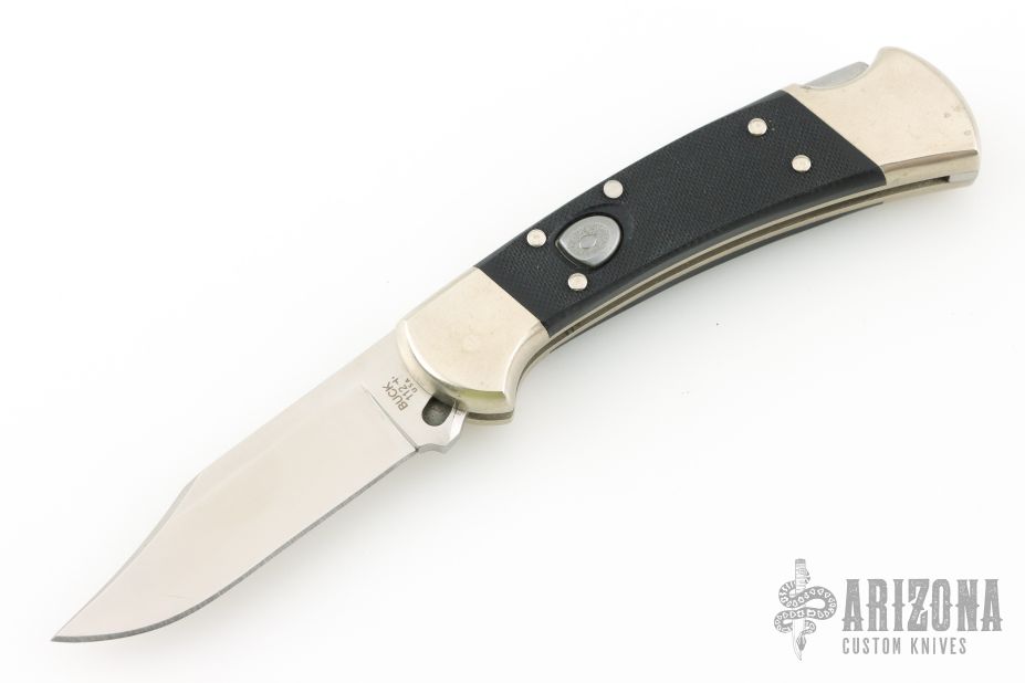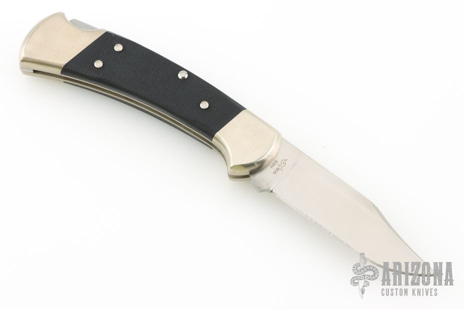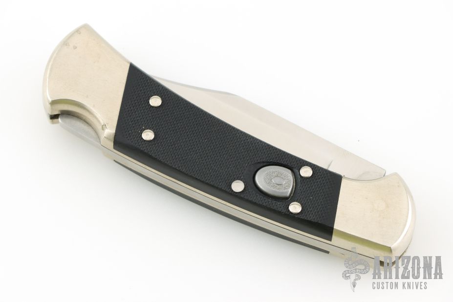 This Buck 112 Auto features a satin finished clip point blade. The handle has a nickel silver frame with black G-10 scales. Comes in a BM drawstring pouch. Has a couple light scratches, Excellent condition.