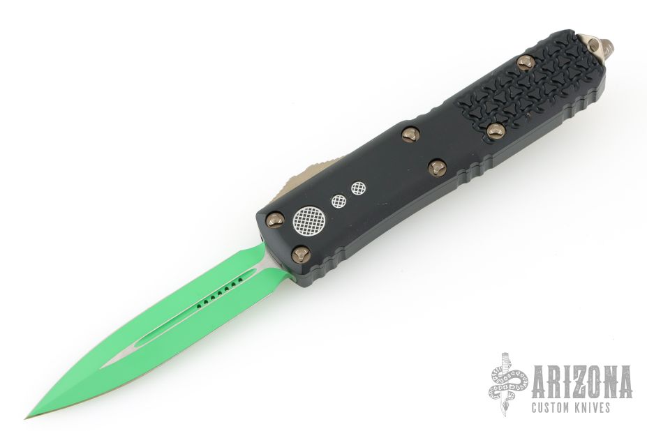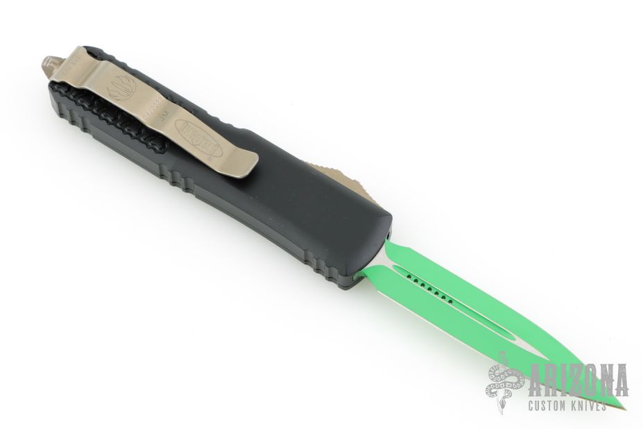 This UTX-85 OTF Automatic from Microtech features a green cerakoted double-edged blade with fuller. The handle has a black aluminum tri grip frame with bronzed steel thumb slide, clip and glass breaker. Dated 04/2022 with an S/N of 5431. Excellent condition. Comes with original box and papers.