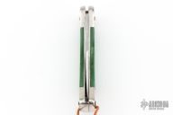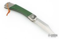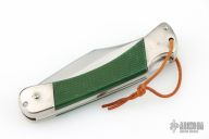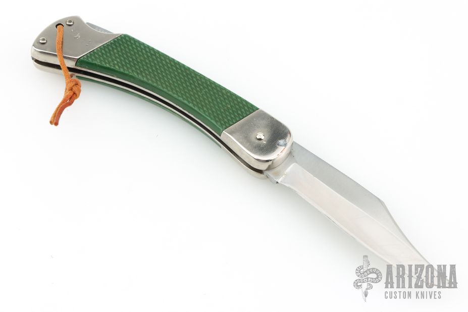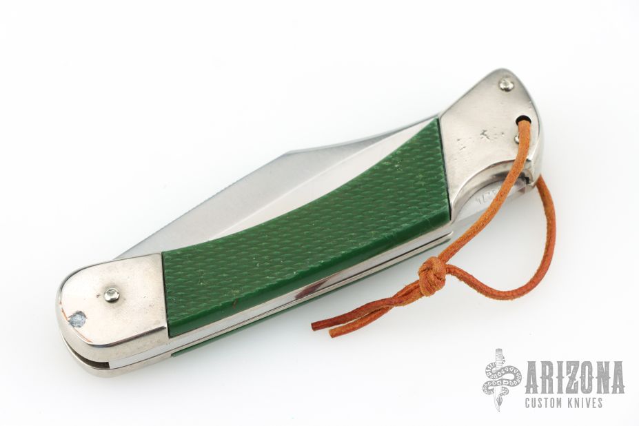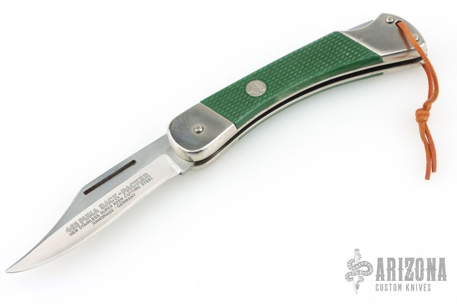 This 465 Puma Back-Packer by Puma Knives, features a satin polish finish clip point blade with nail nick. The handle has nickel plated frame with green insets. Comes with a brown leather belt sheath. Has some scuffs and scratches, has been sharpened, good user condition otherwise.
