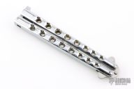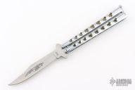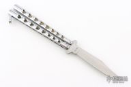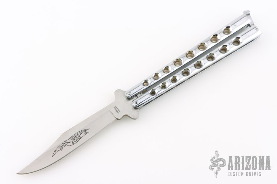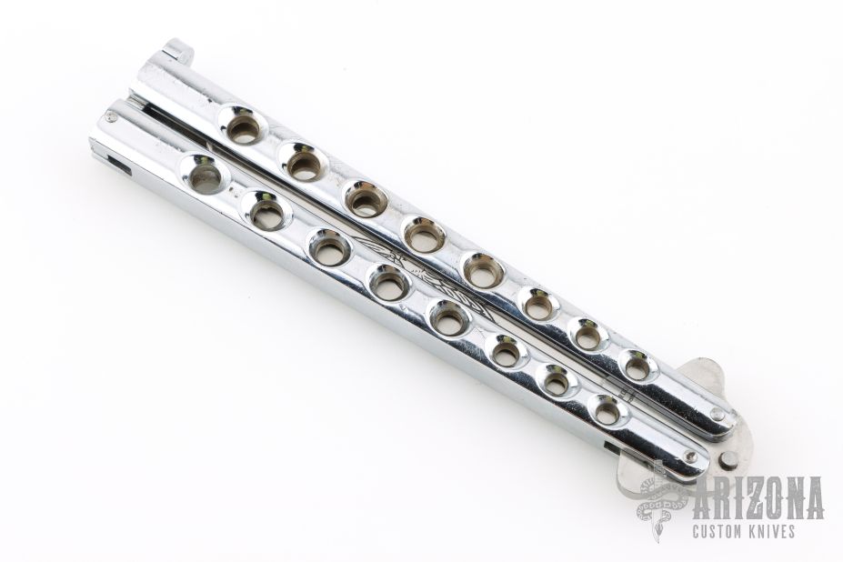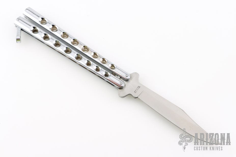 This Balisong by Parker Cutlery Company features a satin finished blade. The handles are chrome plated. Has some scuffs and scratches, otherwise good condition.