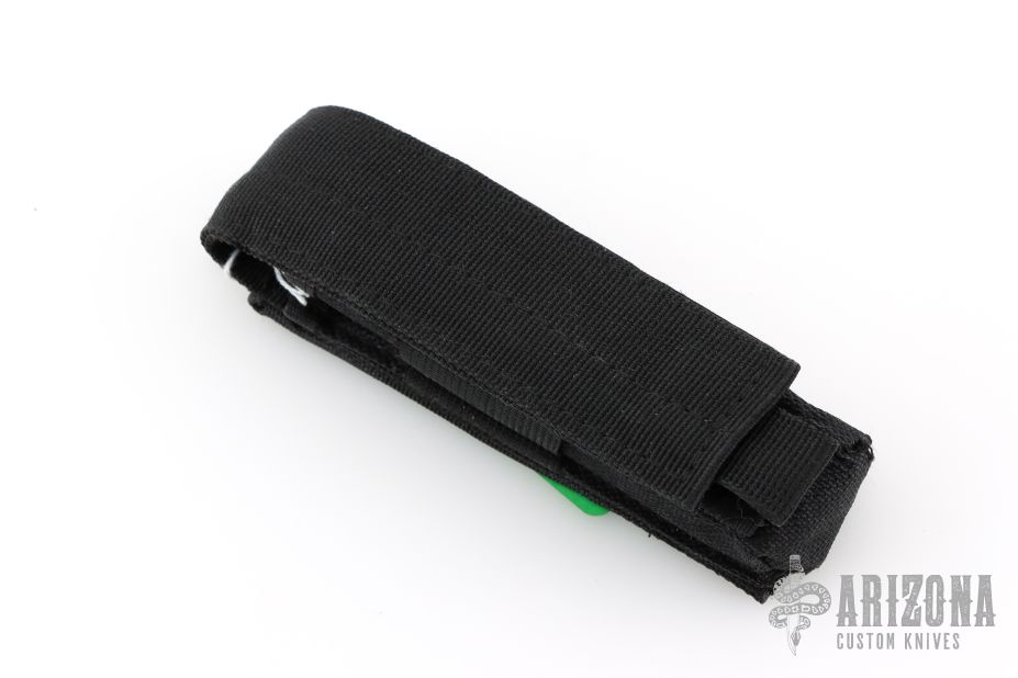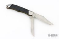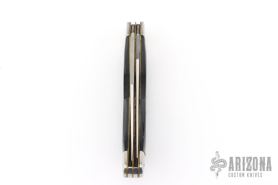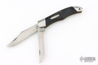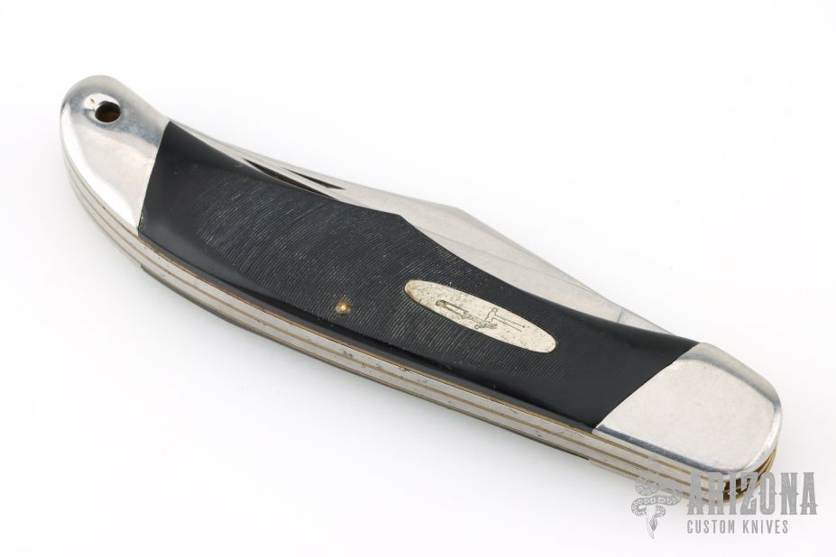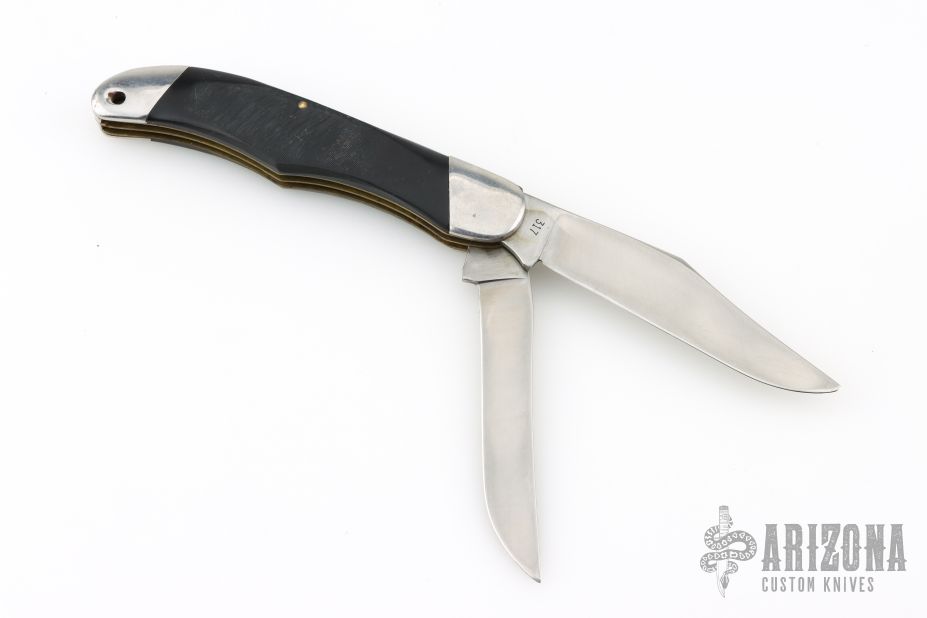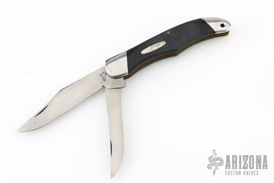 This knife by Buck has a satin finished blades with nail nicks. The handle has steel bolsters, brass liners and steel springs, black saw cut Delrin covers with nickel silver shield inlay. Comes in a nylon belt sheath. Has scuffs and scratches, good condition otherwise.