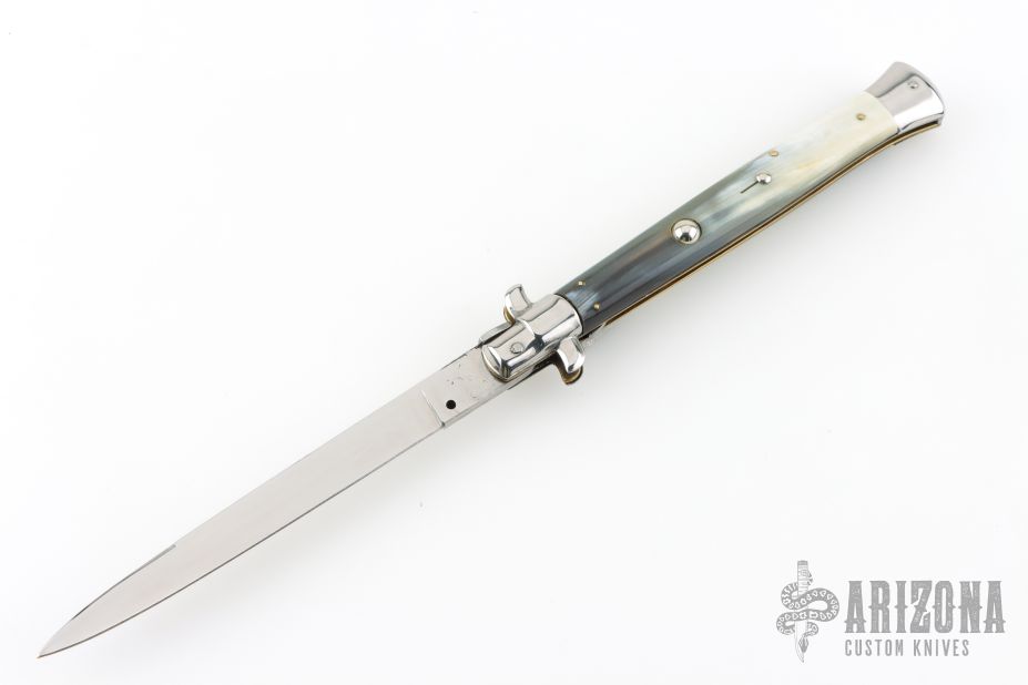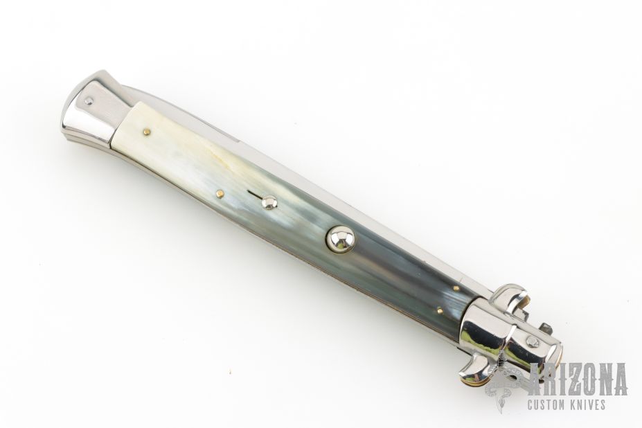 This 13" Swivel Bolster is marked "Rostfrei 7" on the blade, it features a mirror polished blade with false top edge. The handle has nickel silver bolsters, front and rear, buffalo horn scales, brass D-stamp liners, stainless spring. Has some light scratches, otherwise good condition.